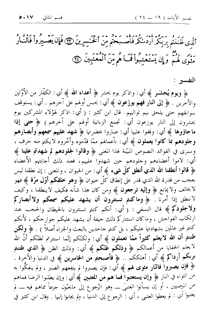 وَما كُنْتُمْ تَسْتَتِرُونَ أَنْ يَشْهَدَ عَلَيْكُمْ سَمْعُكُمْ وَلا أَبْصارُكُمْ وَلا جُلُودُكُمْ قال النسفي: (أي: أنكم كنتم تستترون بالحيطان والحجب عند ارتكاب الفواحش، وما كان استتاركم ذلك خيفة أن يشهد عليكم جوارحكم، لأنكم كنتم غير عالمين بشهادتها عليكم، بل كنتم جاحدين بالبعث والجزاء أصلا). وَلكِنْ ظَنَنْتُمْ أَنَّ اللَّهَ لا يَعْلَمُ كَثِيراً مِمَّا تَعْمَلُونَ أي: ولكنّكم إنّما استترتم لظنّكم أنّ الله لا يعلم الخفايا من أعمالكم