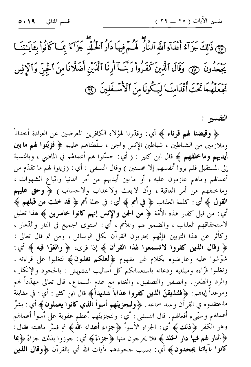 وَقَيَّضْنا لَهُمْ قُرَناءَ أي: وقدّرنا لهؤلاء الكافرين المعرضين عن العبادة أخدانا وملازمين من الشياطين، شياطين الإنس والجن، سلّطناهم عليهم فَزَيَّنُوا لَهُمْ ما بَيْنَ أَيْدِيهِمْ وَما خَلْفَهُمْ قال ابن كثير: (أي: حسّنوا لهم أعمالهم في الماضي، وبالنسبة إلى المستقبل فلم يروا أنفسهم إلا محسنين) وقال النسفي: أي: (زينوا لهم ما تقدّم من أعمالهم وما هم عازمون عليه، أو ما بين أيديهم من أمر الدنيا واتّباع الشهوات، وما خلفهم من أمر العاقبة، وأن لا بعث ولا عذاب ولا حساب) وَحَقَّ عَلَيْهِمُ الْقَوْلُ أي: كلمة العذاب فِي أُمَمٍ أي: في جملة أمم قَدْ خَلَتْ مِنْ قَبْلِهِمْ أي: من قبل كفار هذه الأمّة مِنَ الْجِنِّ وَالْإِنْسِ إِنَّهُمْ كانُوا خاسِرِينَ هذا تعليل لاستحقاقهم العذاب، والضمير لهم وللأمم، أي: