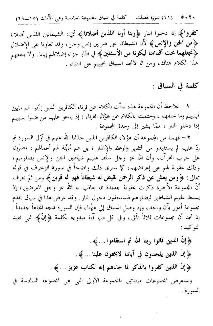 2 - فهمنا من المجموعة أن هؤلاء الكافرين الذين حدّثنا الله عنهم في أوّل السورة ثم ردّ عليهم لم يستفيدوا من التقرير والوعظ والإنذار؛ بل هم مزيّنة لهم أعمالهم، مصرّون على حرب القرآن، وأن الله عزّ وجل سلّط عليهم شياطين الجن والإنس يضلونهم، وذلك عقوبة لهم على إعراضهم، كما سنرى ذلك واضحا في سورة الزخرف في قوله تعالى: وَمَنْ يَعْشُ عَنْ ذِكْرِ الرَّحْمنِ نُقَيِّضْ لَهُ شَيْطاناً فَهُوَ لَهُ قَرِينٌ ومن ثمّ نعرف أنّ المجموعة الأخيرة ذكرت عقوبة جديدة مما يعاقب به الله عزّ وجل المعرضين، إذ يسلط عليهم الشياطين ليضلوهم فيستحقون دخول النار. وقد عرض هذا في سياق يخدم مجموعة أمور بآن واحد، وإذ وصل السياق إلى هاهنا، فإن السورة تتجه اتجاها جديدا.