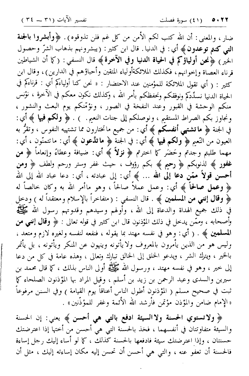 وَمَنْ أَحْسَنُ قَوْلًا مِمَّنْ دَعا إِلَى اللَّهِ ... أي: إلى عبادته، أي: دعا عباد الله إلى الله وَعَمِلَ صالِحاً أي: وعمل عملا صالحا، وهو ما أمر الله به وكان خالصا له وَقالَ إِنَّنِي مِنَ الْمُسْلِمِينَ. قال النسفي: (متفاخرا بالإسلام ومعتقدا له) ودخل في ذلك جميع الهداة والدعاة إلى الله، وأولهم وسيدهم وقدوتهم رسول الله صلّى الله عليه وسلم وأصحابه، وممّن يدخل في ذلك المؤذنون قال ابن كثير في قوله تعالى: وَقالَ إِنَّنِي مِنَ الْمُسْلِمِينَ. (أي: وهو في نفسه مهتد بما يقوله، فنفعه لنفسه ولغيره لازم ومتعد.