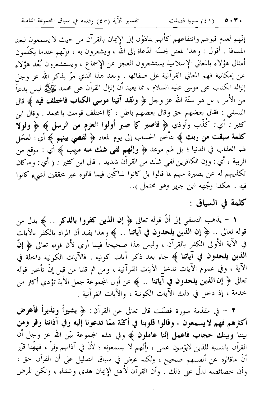 لا يَأْتِيهِ الْباطِلُ مِنْ بَيْنِ يَدَيْهِ وَلا مِنْ خَلْفِهِ قال ابن كثير: أي: ليس للبطلان إليه سبيل، لأنه منزّل من رب العالمين: قال النسفي: أي: لا يأتيه التبديل أو التناقض ... بوجه من الوجوه أقول: أي: لا من الماضي ولا من المستقبل. فالماضي يؤيده والمستقبل يؤيده، فلا ينقضه ماض ولا مستقبل تَنْزِيلٌ مِنْ حَكِيمٍ في أقواله وأفعاله حَمِيدٍ أي: مستحق للحمد، أي: محمود في جميع ما يأمر به وينهى عنه، جميع ذلك محمودة عواقبه وغاياته