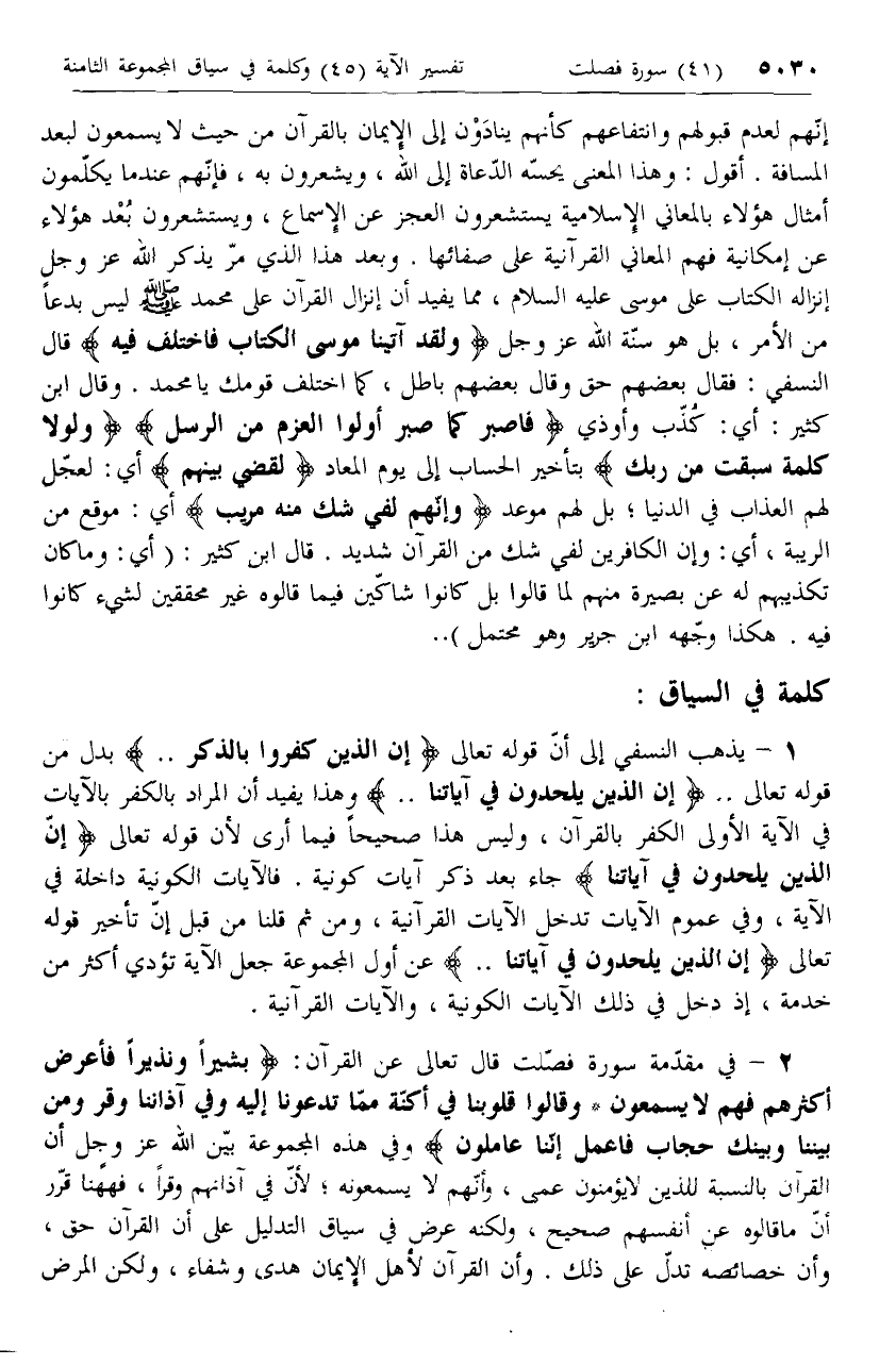 1 - يذهب النسفي إلى أنّ قوله تعالى إِنَّ الَّذِينَ كَفَرُوا بِالذِّكْرِ .. بدل من قوله تعالى .. إِنَّ الَّذِينَ يُلْحِدُونَ فِي آياتِنا .. وهذا يفيد أن المراد بالكفر بالآيات في الآية الأولى الكفر بالقرآن، وليس هذا صحيحا فيما أرى لأن قوله تعالى إِنَّ الَّذِينَ يُلْحِدُونَ فِي آياتِنا جاء بعد ذكر آيات كونية. فالآيات الكونية داخلة في الآية، وفي عموم الآيات تدخل الآيات القرآنية، ومن ثم قلنا من قبل إنّ تأخير قوله تعالى إِنَّ الَّذِينَ يُلْحِدُونَ فِي آياتِنا .. عن أول المجموعة جعل الآية تؤدي أكثر من خدمة، إذ دخل في ذلك الآيات الكونية، والآيات القرآنية.