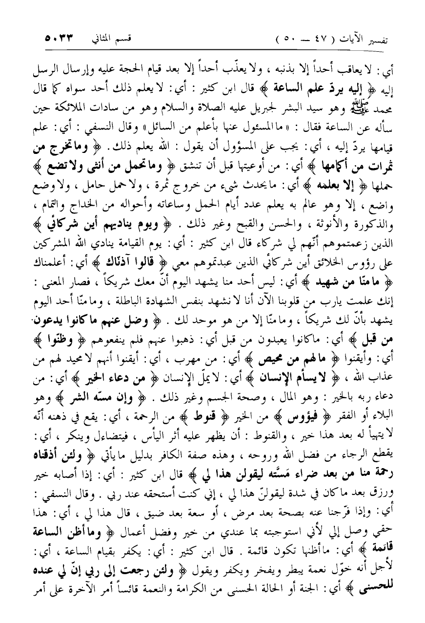 إِلَيْهِ يُرَدُّ عِلْمُ السَّاعَةِ قال ابن كثير: أي: لا يعلم ذلك أحد سواه كما قال محمد صلّى الله عليه وسلم وهو سيد البشر لجبريل عليه الصلاة والسلام وهو من سادات الملائكة حين سأله عن الساعة فقال: «ما المسئول عنها بأعلم من السائل» وقال النسفي: أي: علم قيامها يردّ إليه، أي: يجب على المسئول أن يقول: الله يعلم ذلك. وَما تَخْرُجُ مِنْ ثَمَراتٍ مِنْ أَكْمامِها أي: من أوعيتها قبل أن تنشق وَما تَحْمِلُ مِنْ أُنْثى وَلا تَضَعُ حملها إِلَّا بِعِلْمِهِ أي: ما يحدث شيء من خروج ثمرة، ولا حمل حامل، ولا وضع واضع، إلا وهو عالم به يعلم عدد أيام الحمل وساعاته وأحواله من الخداج والتمام، والذكورة والأنوثة، والحسن والقبح وغير ذلك. وَيَوْمَ يُنادِيهِمْ أَيْنَ شُرَكائِي الذين زعمتموهم أنّهم لي شركاء قال ابن كثير: أي: يوم القيامة ينادي الله المشركين على رءوس الخلائق أين شركائي الذين عبدتموهم معي قالُوا آذَنَّاكَ أي: أعلمناك ما مِنَّا مِنْ شَهِيدٍ أي: ليس أحد منا يشهد اليوم أنّ معك شريكا، فصار المعنى:
