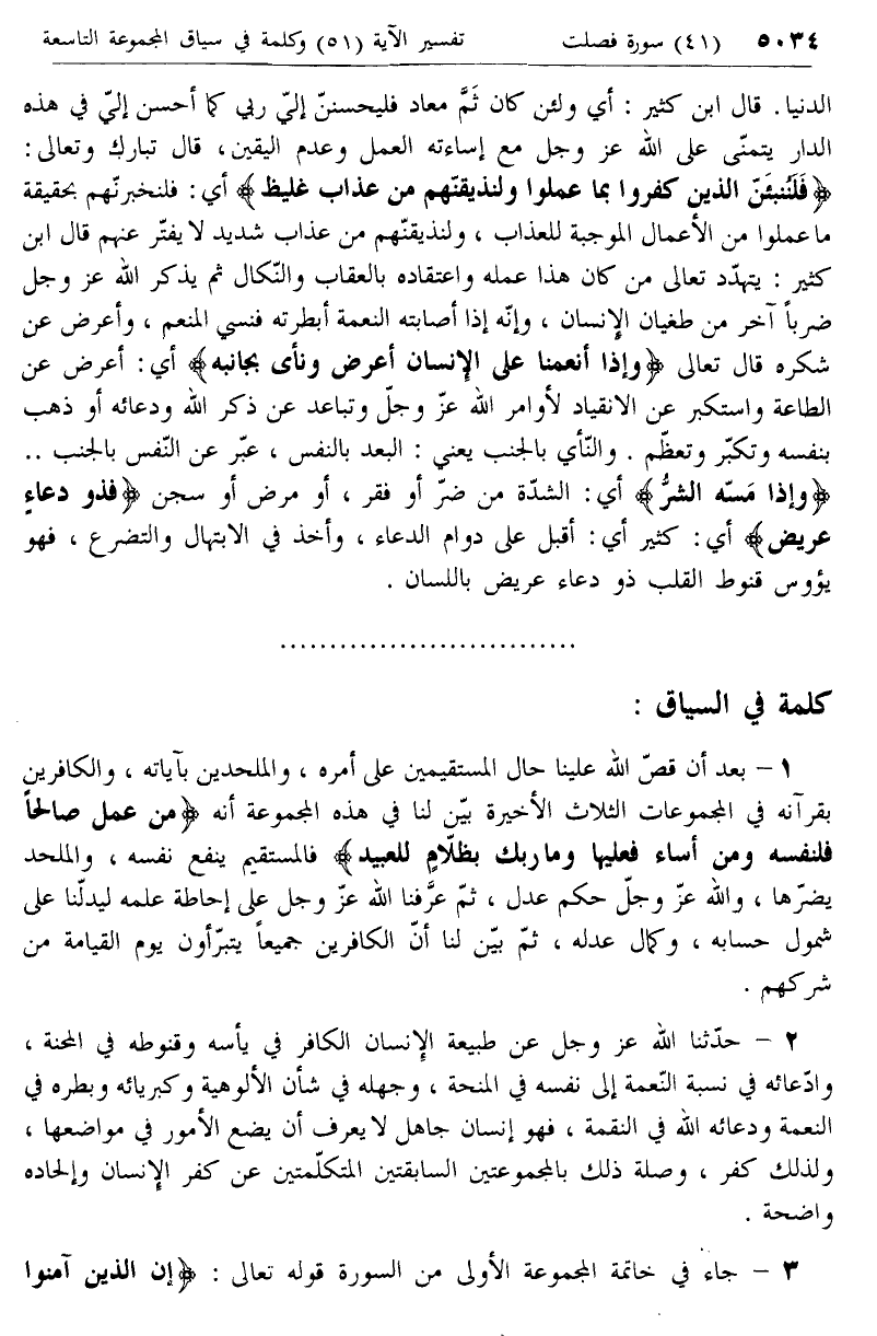 1 - بعد أن قصّ الله علينا حال المستقيمين على أمره، والملحدين بآياته، والكافرين بقرآنه في المجموعات الثلاث الأخيرة بيّن لنا في هذه المجموعة أنه مَنْ عَمِلَ صالِحاً فَلِنَفْسِهِ وَمَنْ أَساءَ فَعَلَيْها وَما رَبُّكَ بِظَلَّامٍ لِلْعَبِيدِ فالمستقيم ينفع نفسه، والملحد يضرّها، والله عزّ وجلّ حكم عدل، ثمّ عرّفنا الله عزّ وجل على إحاطة علمه ليدلّنا على شمول حسابه، وكمال عدله، ثمّ بيّن لنا أنّ الكافرين جميعا يتبّرءون يوم القيامة من شركهم.