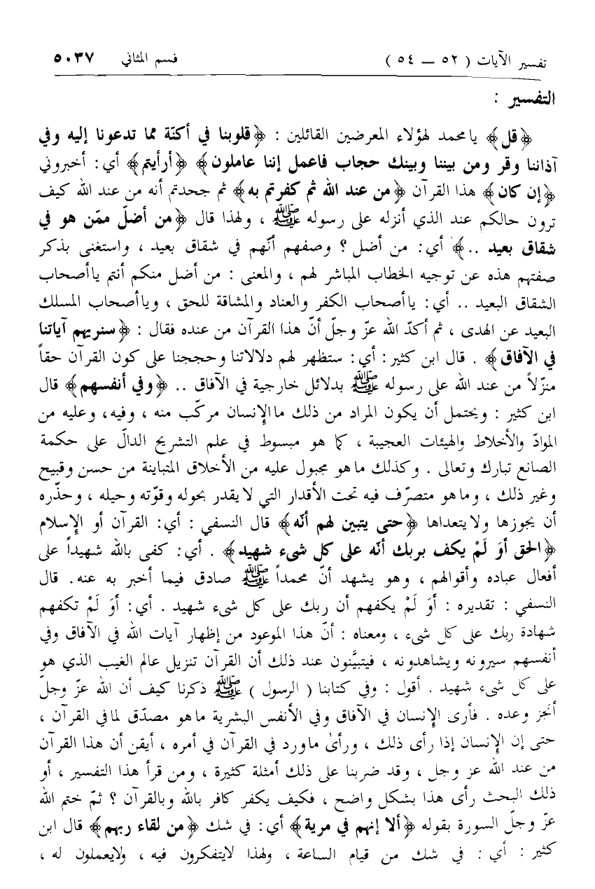 ثم أكّد الله عزّ وجلّ أنّ هذا القرآن من عنده فقال: سَنُرِيهِمْ آياتِنا فِي الْآفاقِ. قال ابن كثير: أي: ستظهر لهم دلالاتنا وحججنا على كون القرآن حقا منزّلا من عند الله على رسوله صلّى الله عليه وسلم بدلائل خارجية في الآفاق .. وَفِي أَنْفُسِهِمْ قال ابن كثير: ويحتمل أن يكون المراد من ذلك ما الإنسان مركّب منه، وفيه، وعليه من الموادّ والأخلاط والهيئات العجيبة، كما هو مبسوط في علم التشريح الدالّ على حكمة الصانع تبارك وتعالى. وكذلك ما هو مجبول عليه من الأخلاق المتباينة من حسن وقبيح وغير ذلك، وما هو متصرّف فيه تحت الأقدار التي لا يقدر بحوله وقوّته وحيله، وحذّره أن يجوزها ولا يتعداها حَتَّى يَتَبَيَّنَ لَهُمْ أَنَّهُ قال النسفي: أي: القرآن أو الإسلام الْحَقُّ أَوَلَمْ يَكْفِ بِرَبِّكَ أَنَّهُ عَلى كُلِّ شَيْءٍ شَهِيدٌ. أي: كفى بالله شهيدا على أفعال عباده وأقوالهم، وهو يشهد أنّ محمدا صلّى الله عليه وسلم صادق فيما أخبر به عنه. قال النسفي: تقديره: أو لم يكفهم أن ربك على كل شئ شهيد. أي: أو لم تكفهم شهادة ربك على كل شئ، ومعناه: أنّ هذا الموعود من إظهار آيات الله في الآفاق وفي أنفسهم سيرونه ويشاهدونه، فيتبيّنون عند ذلك أن القرآن تنزيل عالم الغيب الذي هو على كل شئ شهيد. أقول: وفي كتابنا (الرسول) صلّى الله عليه وسلم ذكرنا كيف أن الله عزّ وجلّ أنجز وعده. فأرى الإنسان في الآفاق وفي الأنفس البشرية ما هو مصدّق لما في القرآن، حتى إن الإنسان إذا رأى ذلك، ورأى ما ورد في القرآن في أمره، أيقن أن هذا القرآن من عند الله عزّ وجل، وقد ضربنا على ذلك أمثلة كثيرة، ومن قرأ هذا التفسير، أو ذلك البحث رأى هذا بشكل واضح، فكيف يكفر كافر بالله وبالقرآن؟ ثمّ ختم الله عزّ وجلّ السورة بقوله
