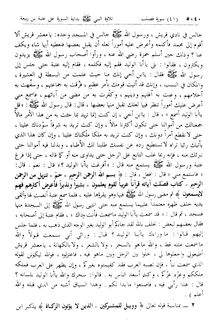 «فاستمع مني» قال: افعل، قال: بِسْمِ اللَّهِ الرَّحْمنِ الرَّحِيمِ* حم* تَنْزِيلٌ مِنَ الرَّحْمنِ الرَّحِيمِ* كِتابٌ فُصِّلَتْ آياتُهُ قُرْآناً عَرَبِيًّا لِقَوْمٍ يَعْلَمُونَ* بَشِيراً وَنَذِيراً فَأَعْرَضَ أَكْثَرُهُمْ فَهُمْ لا يَسْمَعُونَ ثم مضى رسول الله صلّى الله عليه وسلم فيها وهو يقرؤها عليه، فلما سمع عتبة أنصت لها وألقى يديه خلف ظهره معتمدا عليهما يستمع منه حتى انتهى رسول الله صلّى الله عليه وسلم إلى السجدة منها فسجد، ثم قال: «قد سمعت يا أبا الوليد ما سمعت فأنت وذاك»، فقام عتبة إلى أصحابه، فقال بعضهم لبعض: نحلف بالله لقد جاءكم أبو الوليد بغير الوجه الذي ذهب به، فلما جلس إليهم قالوا: ما وراءك يا أبا الوليد؟ قال: ورائي أني سمعت قولا والله ما سمعت مثله قط، والله ما هو بالسحر، ولا بالشعر، ولا بالكهانة، يا معشر قريش أطيعوني واجعلوها لي، خلّوا بين الرجل وبين ما هو فيه، فاعتزلوه، فو الله ليكونن لقوله الذي سمعت نبأ، فإن تصبه العرب فقد كفيمتوه بغيركم، وإن يظهر على العرب فملكه ملككم وعزّه عزّكم، وكنتم أسعد الناس به. قالوا: سحرك والله يا أبا الوليد بلسانه؟