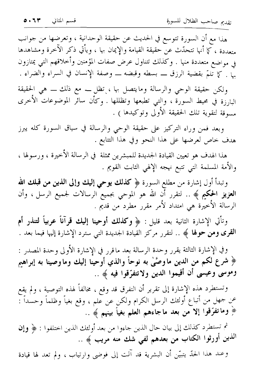 ولكن حقيقة الوحي والرسالة وما يتصل بها، تظل- مع ذلك- هي الحقيقة البارزة في محيط السورة، والتي تطبعها وتظللها. وكأن سائر الموضوعات الأخرى مسوقة لتقوية تلك الحقيقة الأولى وتوكيدها).