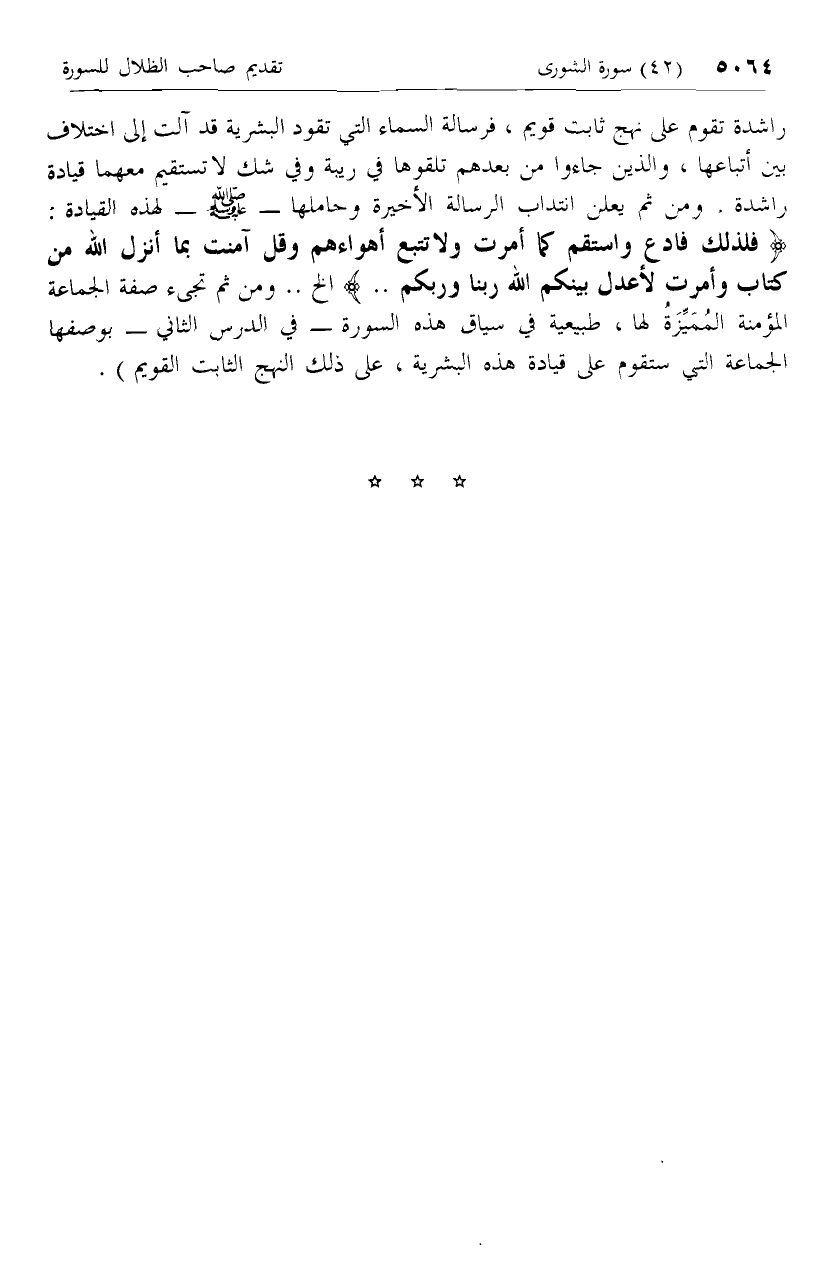 فَلِذلِكَ فَادْعُ وَاسْتَقِمْ كَما أُمِرْتَ وَلا تَتَّبِعْ أَهْواءَهُمْ وَقُلْ آمَنْتُ بِما أَنْزَلَ اللَّهُ مِنْ كِتابٍ وَأُمِرْتُ لِأَعْدِلَ بَيْنَكُمُ اللَّهُ رَبُّنا وَرَبُّكُمْ .. الخ .. ومن ثم تجئ صفة الجماعة المؤمنة