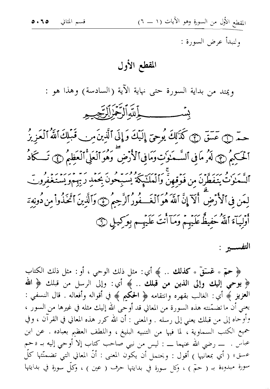 المقطع الأول ويمتد من بداية السورة حتى نهاية الآية (السادسة) وهذا هو: