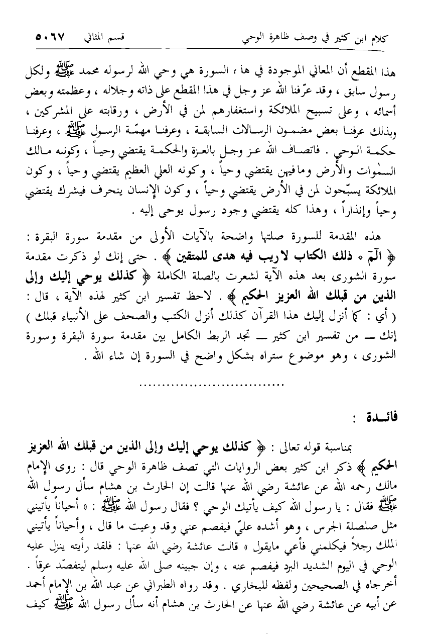بمناسبة قوله تعالى: كَذلِكَ يُوحِي إِلَيْكَ وَإِلَى الَّذِينَ مِنْ قَبْلِكَ اللَّهُ الْعَزِيزُ الْحَكِيمُ ذكر ابن كثير بعض الروايات التي تصف ظاهرة الوحي قال: روى الإمام مالك رحمه الله عن عائشة رضي الله عنها قالت إن الحارث بن هشام سأل رسول الله صلّى الله عليه وسلم فقال: يا رسول الله كيف يأتيك الوحي؟ فقال رسول الله صلّى الله عليه وسلم: «أحيانا يأتيني مثل صلصلة الجرس، وهو أشده عليّ فيفصم عني وقد وعيت ما قال، وأحيانا يأتيني الملك رجلا فيكلمني فأعي ما يقول» قالت عائشة رضي الله عنها: فلقد رأيته ينزل عليه الوحي في اليوم الشديد البرد فيفصم عنه، وإن جبينه صلى الله عليه وسلم ليتفصّد عرقا.
