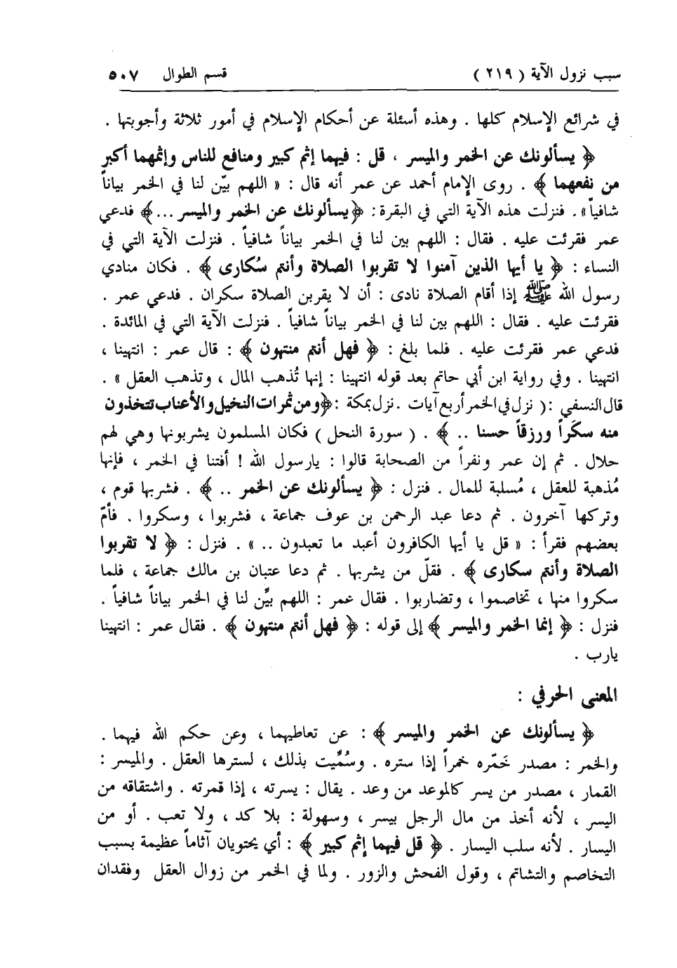 يَسْئَلُونَكَ عَنِ الْخَمْرِ وَالْمَيْسِرِ، قُلْ: فِيهِما إِثْمٌ كَبِيرٌ وَمَنافِعُ لِلنَّاسِ وَإِثْمُهُما أَكْبَرُ مِنْ نَفْعِهِما. روى الإمام أحمد عن عمر أنه قال: «اللهم بين لنا في الخمر بيانا شافيا». فنزلت هذه الآية التي في البقرة: يَسْئَلُونَكَ عَنِ الْخَمْرِ وَالْمَيْسِرِ ... فدعي عمر فقرئت عليه. فقال: اللهم بين لنا في الخمر بيانا شافيا. فنزلت الآية التي في النساء: يا أَيُّهَا الَّذِينَ آمَنُوا لا تَقْرَبُوا الصَّلاةَ وَأَنْتُمْ سُكارى. فكان منادي رسول الله صلى الله عليه وسلم إذا أقام الصلاة نادى: أن لا يقربن الصلاة سكران. فدعي عمر.