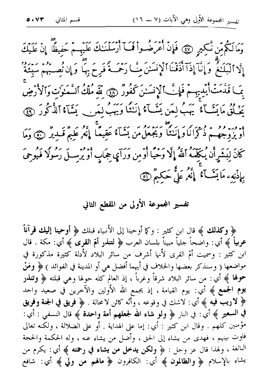 وَكَذلِكَ قال ابن كثير: وكما أوحينا إلى الأنبياء قبلك أَوْحَيْنا إِلَيْكَ قُرْآناً عَرَبِيًّا أي: واضحا جليا مبينا بلسان العرب لِتُنْذِرَ أُمَّ الْقُرى أي: مكة. قال ابن كثير: وسميت أمّ القرى لأنها أشرف من سائر البلاد لأدلة كثيرة مذكورة في مواضعها (وسنذكر بعضها والخلاف في أيهما أفضل هي أو المدينة في الفوائد) وَمَنْ حَوْلَها أي: من سائر البلاد شرقا وغربا، إذ العالم كله حولها وهي قبلته وَتُنْذِرَ يَوْمَ الْجَمْعِ أي: يوم القيامة، إذ يجمع الله الأولين والآخرين في صعيد واحد لا رَيْبَ فِيهِ أي: لا شك في وقوعه، وأنّه كائن لا محالة. فَرِيقٌ فِي الْجَنَّةِ وَفَرِيقٌ فِي السَّعِيرِ أي: في النار