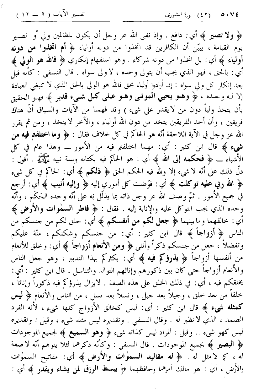 ثمّ وصف الله عزّ وجل ذاته بما يذلّل به على أنّه وحده الحكم، وأنّه وحده الذي يجب التوكل عليه والإنابة إليه. فقال: فاطِرُ السَّماواتِ وَالْأَرْضِ أي: خالقهما وما بينهما جَعَلَ لَكُمْ مِنْ أَنْفُسِكُمْ أي: خلق لكم من جنسكم من الناس أَزْواجاً قال ابن كثير: أي: من جنسكم وشكلكم، منّة عليكم وتفضلا، جعل من جنسكم ذكرا وأنثى وَمِنَ الْأَنْعامِ أَزْواجاً أي: وخلق للأنعام من أنفسها أزواجا يَذْرَؤُكُمْ فِيهِ أي: يكثركم بهذا التدبير، وهو جعل الناس والأنعام أزواجا حتى كان بين ذكورهم وإناثهم التوالد والتناسل. قال ابن كثير: أي: