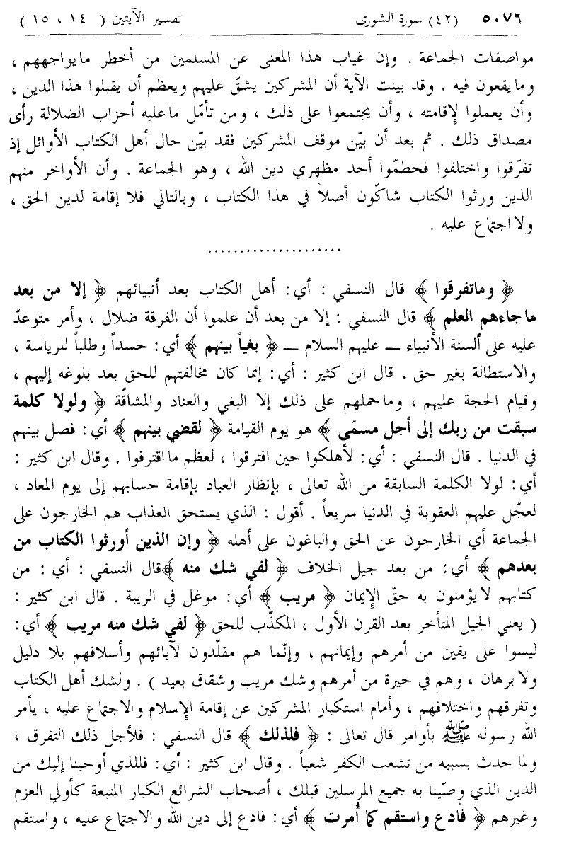 وَما تَفَرَّقُوا قال النسفي: أي: أهل الكتاب بعد أنبيائهم إِلَّا مِنْ بَعْدِ ما جاءَهُمُ الْعِلْمُ قال النسفي: إلا من بعد أن علموا أن الفرقة ضلال، وأمر متوعد عليه على ألسنة الأنبياء- عليهم السلام- بَغْياً بَيْنَهُمْ أي: حسدا وطلبا للرئاسة، والاستطالة بغير حق. قال ابن كثير: أي: إنما كان مخالفتهم للحق بعد بلوغه إليهم، وقيام الحجة عليهم، وما حملهم على ذلك إلا البغي والعناد والمشاقّة وَلَوْلا كَلِمَةٌ سَبَقَتْ مِنْ رَبِّكَ إِلى أَجَلٍ مُسَمًّى هو يوم القيامة لَقُضِيَ بَيْنَهُمْ أي: فصل بينهم في الدنيا. قال النسفي: أي: لأهلكوا حين افترقوا، لعظم ما اقترفوا. وقال ابن كثير: