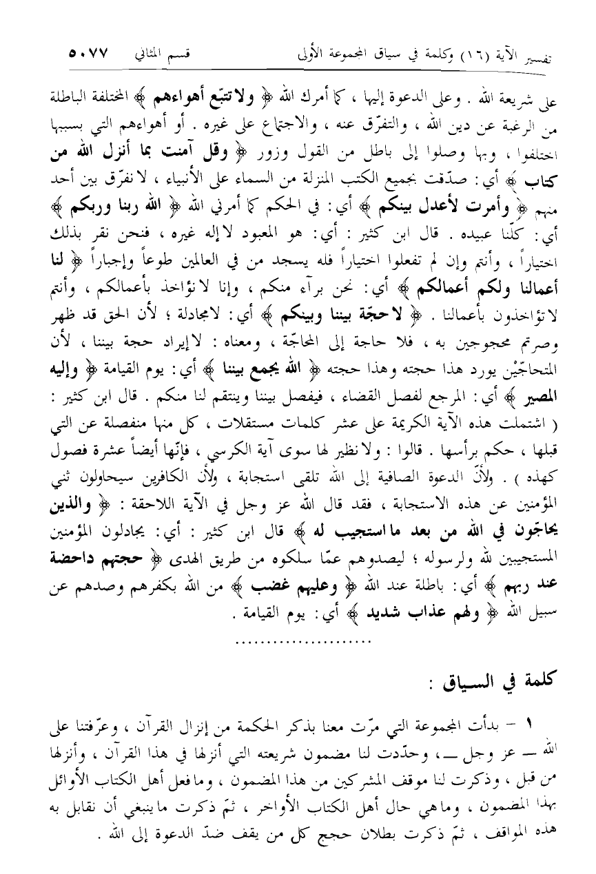 على شريعة الله. وعلى الدعوة إليها، كما أمرك الله وَلا تَتَّبِعْ أَهْواءَهُمْ المختلفة الباطلة من الرغبة عن دين الله، والتفرّق عنه، والاجتماع على غيره. أو أهواءهم التي بسببها اختلفوا، وبها وصلوا إلى باطل من القول وزور وَقُلْ آمَنْتُ بِما أَنْزَلَ اللَّهُ مِنْ كِتابٍ أي: صدّقت بجميع الكتب المنزلة من السماء على الأنبياء، لا نفرّق بين أحد منهم وَأُمِرْتُ لِأَعْدِلَ بَيْنَكُمُ أي: في الحكم كما أمرني الله اللَّهُ رَبُّنا وَرَبُّكُمْ أي: كلّنا عبيده. قال ابن كثير: أي: هو المعبود لا إله غيره، فنحن نقر بذلك اختيارا، وأنتم وإن لم تفعلوا اختيارا فله يسجد من في العالمين طوعا وإجبارا لَنا أَعْمالُنا وَلَكُمْ أَعْمالُكُمْ أي: نحن برآء منكم، وإنا لا نؤاخذ بأعمالكم، وأنتم لا تؤاخذون بأعمالنا. لا حُجَّةَ بَيْنَنا وَبَيْنَكُمُ أي: لا مجادلة؛ لأن الحق قد ظهر وصرتم محجوجين به، فلا حاجة إلى المحاجّة، ومعناه: لا إيراد حجة بيننا، لأن المتحاجّين يورد هذا حجته وهذا حجته اللَّهُ يَجْمَعُ بَيْنَنا أي: يوم القيامة وَإِلَيْهِ الْمَصِيرُ أي: المرجع لفصل القضاء، فيفصل بيننا وينتقم لنا منكم. قال ابن كثير: