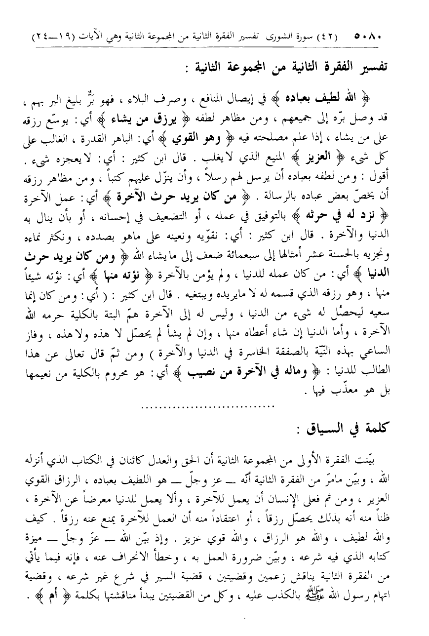 بيّنت الفقرة الأولى من المجموعة الثانية أن الحق والعدل كائنان في الكتاب الذي أنزله الله، وبيّن ما مرّ من الفقرة الثانية أنّه- عزّ وجلّ- هو اللطيف بعباده، الرزاق القوي العزيز، ومن ثم فعلى الإنسان أن يعمل للآخرة، وألا يعمل للدنيا معترضا عن الآخرة، ظنا منه أنه بذلك يحصّل رزقا، أو اعتقادا منه أن العمل للآخرة يمنع عنه رزقا. كيف والله لطيف، والله هو الرزاق، والله قوي عزيز. وإذ بيّن الله- عزّ وجلّ- ميزة كتابه الذي فيه شرعه، وبيّن ضرورة العمل به، وخطأ الانحراف عنه، فإنه فيما يأتي من الفقرة الثانية يناقش زعمين وقضيتين، قضية السير في شرع غير شرعه، وقضية اتهام رسول الله صلّى الله عليه وسلم بالكذب عليه، وكل من القضيتين يبدأ مناقشتها بكلمة أَمْ.