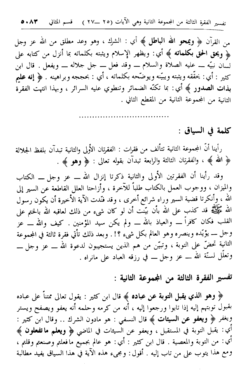 من القرآن وَيَمْحُ اللَّهُ الْباطِلَ أي: الشرك، وهو وعد مطلق من الله عزّ وجل وَيُحِقُّ الْحَقَّ بِكَلِماتِهِ أي: ويظهر الإسلام ويثبته بكلماته بما أنزل من كتابه على لسان نبيّه- عليه الصلاة والسلام- وقد فعل- جل جلاله- ويفعل. قال ابن كثير: أي: يحقّقه ويثبته ويبيّنه ويوضّحه بكلماته، أي: بحججه وبراهينه. إِنَّهُ عَلِيمٌ بِذاتِ الصُّدُورِ أي: بما تكنّه الضمائر وتنطوي عليه السرائر، وبهذا انتهت الفقرة الثانية من المجموعة الثانية من المقطع الثاني.