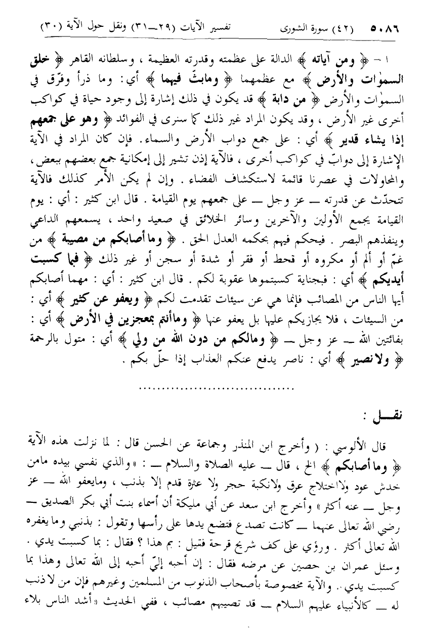 نقل: [عن الألوسي حول قوله تعالى وَما أَصابَكُمْ مِنْ مُصِيبَةٍ فَبِما كَسَبَتْ أَيْدِيكُمْ .. ]