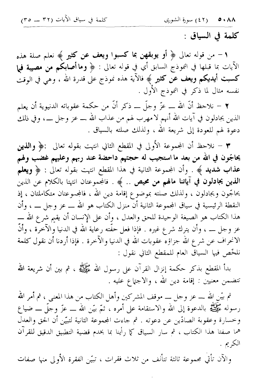 3 - نلاحظ أن المجموعة الأولى في المقطع الثاني انتهت بقوله تعالى: وَالَّذِينَ يُحَاجُّونَ فِي اللَّهِ مِنْ بَعْدِ ما اسْتُجِيبَ لَهُ حُجَّتُهُمْ داحِضَةٌ عِنْدَ رَبِّهِمْ وَعَلَيْهِمْ غَضَبٌ وَلَهُمْ عَذابٌ شَدِيدٌ. وأن المجموعة الثانية في هذا المقطع انتهت بقوله تعالى: وَيَعْلَمَ الَّذِينَ يُجادِلُونَ فِي آياتِنا ما لَهُمْ مِنْ مَحِيصٍ ... فالمجموعتان انتهتا بالكلام عن الذين يحاجّون ويجادلون، ولذلك صلته بموضوع إقامة دين الله، فالمجموعتان متكاملتان، إذ النقطة الرئيسية في سياق المجموعة الثانية أن منزل الكتاب هو الله- عزّ وجل-، وأن هذا الكتاب هو الصيغة الوحيدة للحق والعدل، وأن على الإنسان أن يقيم شرع الله- عزّ وجل-، وأن يترك شرع غيره. فإذا فعل حفّته رعاية الله في الدنيا والآخرة، وأنّ الانحراف عن شرع الله جزاؤه عقوبات الله في الدنيا والآخرة. فإذا أردنا أن نقول كلمة نلخّص فيها السياق العام للمقطع الثاني نقول: