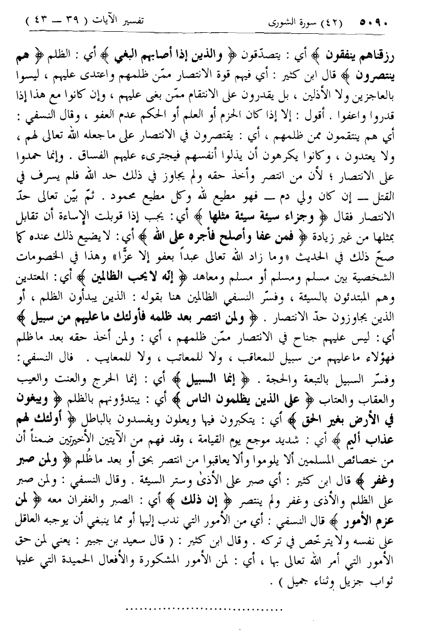 وَالَّذِينَ إِذا أَصابَهُمُ الْبَغْيُ أي: الظلم هُمْ يَنْتَصِرُونَ قال ابن كثير: أي فيهم قوة الانتصار ممّن ظلمهم واعتدى عليهم، ليسوا بالعاجزين ولا الأذلين، بل يقدرون على الانتقام ممّن بغى عليهم، وإن كانوا مع هذا إذا قدروا واعفوا. أقول: إلا إذا كان الحزم أو العلم أو الحكم عدم العفو، وقال النسفي: