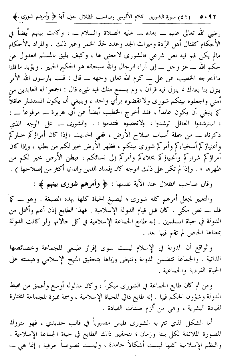 وقال صاحب الظلال عند الآية نفسها: وَأَمْرُهُمْ شُورى بَيْنَهُمْ: