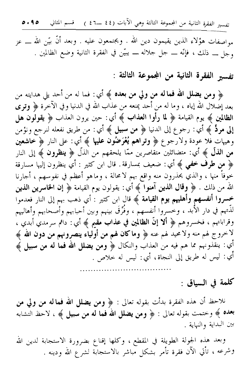 نلاحظ أن هذه الفقرة بدأت بقوله تعالى: وَمَنْ يُضْلِلِ اللَّهُ فَما لَهُ مِنْ وَلِيٍّ مِنْ بَعْدِهِ وختمت بقوله تعالى: وَمَنْ يُضْلِلِ اللَّهُ فَما لَهُ مِنْ سَبِيلٍ، لاحظ التشابه بين البداية والنهاية.