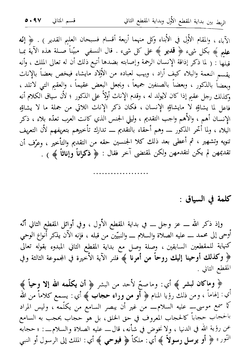 وإذ ذكر الله- عزّ وجل- في بداية المقطع الأول، وفي أوائل المقطع الثاني أنّه أوحى إلى محمد- عليه الصلاة والسلام- والنبيّين من قبله، فإنه الآن يذكر أنواع الوحي كنهاية للمقطعين السابقين، وصلة وصل مع بداية المقطع الثاني المبدوء بقوله تعالى وَكَذلِكَ أَوْحَيْنا إِلَيْكَ رُوحاً مِنْ أَمْرِنا فلنر الآية الأخيرة في المجموعة الثالثة وفي المقطع الثاني.