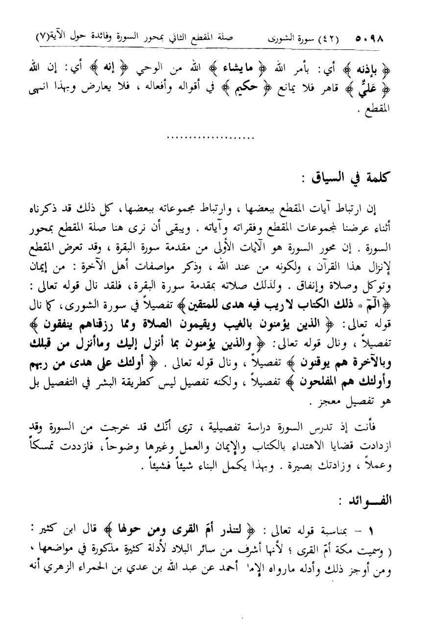 الم* ذلِكَ الْكِتابُ لا رَيْبَ فِيهِ هُدىً لِلْمُتَّقِينَ تفصيلا في سورة الشورى، كما نال قوله تعالى: الَّذِينَ يُؤْمِنُونَ بِالْغَيْبِ وَيُقِيمُونَ الصَّلاةَ وَمِمَّا رَزَقْناهُمْ يُنْفِقُونَ تفصيلا، ونال قوله تعالى: وَالَّذِينَ يُؤْمِنُونَ بِما أُنْزِلَ إِلَيْكَ وَما أُنْزِلَ مِنْ قَبْلِكَ وَبِالْآخِرَةِ هُمْ يُوقِنُونَ تفصيلا، ونال قوله تعالى. أُولئِكَ عَلى هُدىً مِنْ رَبِّهِمْ وَأُولئِكَ هُمُ الْمُفْلِحُونَ تفصيلا، ولكنه تفصيل ليس كطريقة البشر في التفصيل بل هو تفصيل معجز.