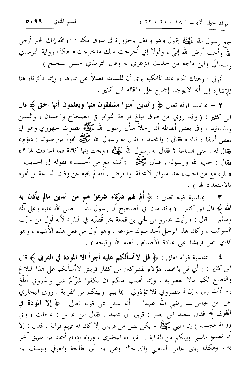 بمناسبة قوله تعالى: قُلْ لا أَسْئَلُكُمْ عَلَيْهِ أَجْراً إِلَّا الْمَوَدَّةَ فِي الْقُرْبى قال ابن كثير: (أي قل يا محمد لهؤلاء المشركين من كفار قريش لا أسألكم على هذا البلاغ والنصح لكم مالا تعطونيه، وإنما أطلب منكم أن تكفوا شرّكم عني وتذروني أبلّغ رسالات ربي، إن لم تنصروني فلا تؤذوني. بما بيني وبينكم من القرابة. روى البخاري عن ابن عباس- رضي الله عنهما- أنه سئل عن قوله تعالى: إِلَّا الْمَوَدَّةَ فِي الْقُرْبى فقال سعيد ابن جبير: قربى آل محمد. فقال ابن عباس: عجلت (وفي رواية عجيب) إن النبي صلّى الله عليه وسلم لم يكن بطن من قريش إلا كان له فيهم قرابة. فقال: إلا أن تصلوا ما بيني وبينكم من القرابة. انفرد به البخاري، ورواه الإمام أحمد من طريق آخر به، وهكذا روى عامر الشعبي والضحاك وعلي بن أبي طلحة والعوفي ويوسف بن