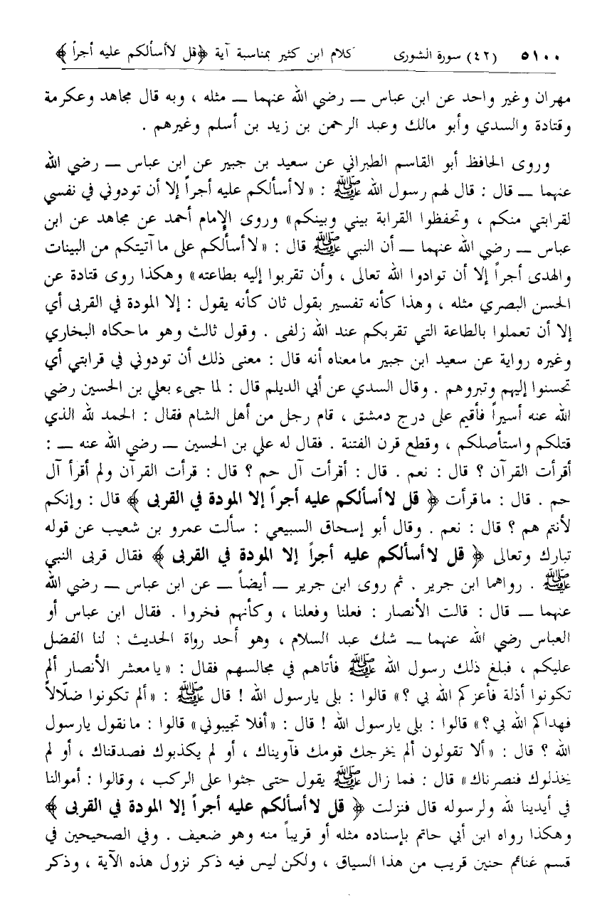 أقرأت القرآن؟ قال: نعم. قال: أقرأت آل حم؟ قال: قرأت القرآن ولم أقرأ آل حم. قال: ما قرأت قُلْ لا أَسْئَلُكُمْ عَلَيْهِ أَجْراً إِلَّا الْمَوَدَّةَ فِي الْقُرْبى قال: وإنكم لأنتم هم؟ قال: نعم. وقال أبو إسحاق السبيعي: سألت عمرو بن شعيب عن قوله تبارك وتعالى قُلْ لا أَسْئَلُكُمْ عَلَيْهِ أَجْراً إِلَّا الْمَوَدَّةَ فِي الْقُرْبى فقال قربى النبي صلّى الله عليه وسلم. رواهما ابن جرير. ثم روى ابن جرير- أيضا- عن ابن عباس- رضي الله عنهما- قال: قالت الأنصار: فعلنا وفعلنا، وكأنهم فخروا. فقال ابن عباس أو العباس رضي الله عنهما- شك عبد السلام، وهو أحد رواة الحديث: لنا الفضل عليكم، فبلغ ذلك رسول الله صلّى الله عليه وسلم فأتاهم في مجالسهم فقال: «يا معشر الأنصار ألم تكونوا أذلة فأعزكم الله بي؟» قالوا: بلى يا رسول الله! قال صلّى الله عليه وسلم: «ألم تكونوا ضلّالا فهداكم الله بي؟» قالوا: بلى يا رسول الله! قال: «أفلا تجيبوني» قالوا: ما نقول يا رسول الله؟ قال: «ألا تقولون ألم يخرجك قومك فآويناك، أو لم يكذبوك فصدقناك، أو لم يخذلوك فنصرناك» قال: فما زال صلّى الله عليه وسلم يقول حتى جثوا على الركب، وقالوا: أموالنا في أيدينا لله ولرسوله قال فنزلت قُلْ لا أَسْئَلُكُمْ عَلَيْهِ أَجْراً إِلَّا الْمَوَدَّةَ فِي الْقُرْبى وهكذا رواه ابن أبي حاتم بإسناده مثله أو قريبا منه وهو ضعيف. وفي الصحيحين في قسم غنائم حنين قريب من هذا السياق، ولكن ليس فيه ذكر نزول هذه الآية، وذكر