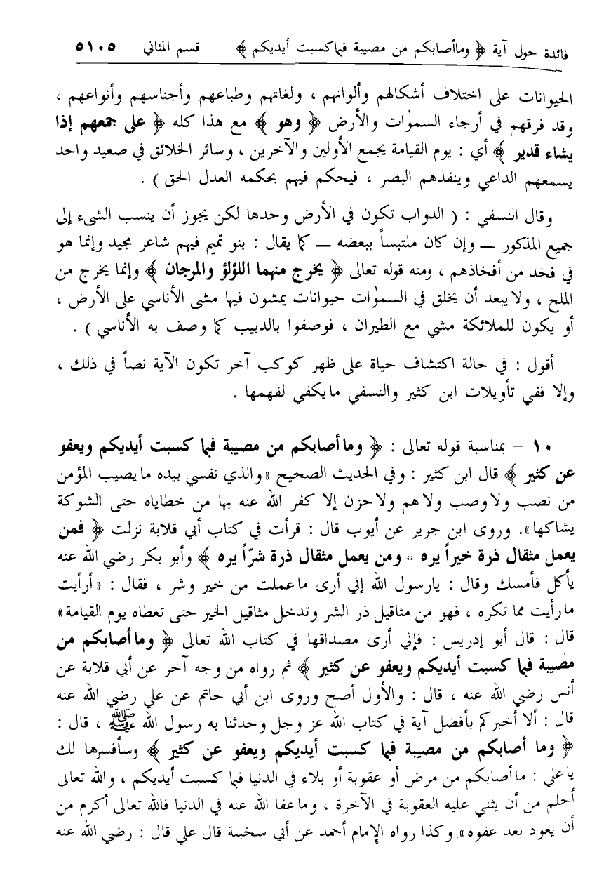 بمناسبة قوله تعالى: وَما أَصابَكُمْ مِنْ مُصِيبَةٍ فَبِما كَسَبَتْ أَيْدِيكُمْ وَيَعْفُوا عَنْ كَثِيرٍ قال ابن كثير: وفي الحديث الصحيح «والذي نفسي بيده ما يصيب المؤمن من نصب ولا وصب ولا هم ولا حزن إلا كفر الله عنه بها من خطاياه حتى الشوكة يشاكها». وروى ابن جرير عن أيوب قال: قرأت في كتاب أبي قلابة نزلت فَمَنْ يَعْمَلْ مِثْقالَ ذَرَّةٍ خَيْراً يَرَهُ* وَمَنْ يَعْمَلْ مِثْقالَ ذَرَّةٍ شَرًّا يَرَهُ وأبو بكر رضي الله عنه يأكل فأمسك وقال: يا رسول الله إني أرى ما عملت من خير وشر، فقال: «أرأيت ما رأيت مما تكره، فهو من مثاقيل ذر الشر وتدخل مثاقيل الخير حتى تعطاه يوم القيامة» قال: قال أبو إدريس: فإني أرى مصداقها في كتاب الله تعالى وَما أَصابَكُمْ مِنْ مُصِيبَةٍ فَبِما كَسَبَتْ أَيْدِيكُمْ وَيَعْفُوا عَنْ كَثِيرٍ ثم رواه من وجه آخر عن أبي قلابة عن أنس رضي الله عنه، قال: والأول أصح وروى ابن أبي حاتم عن علي رضي الله عنه قال: ألا أخبركم بأفضل آية في كتاب الله عزّ وجل وحدثنا به رسول الله صلّى الله عليه وسلم، قال: