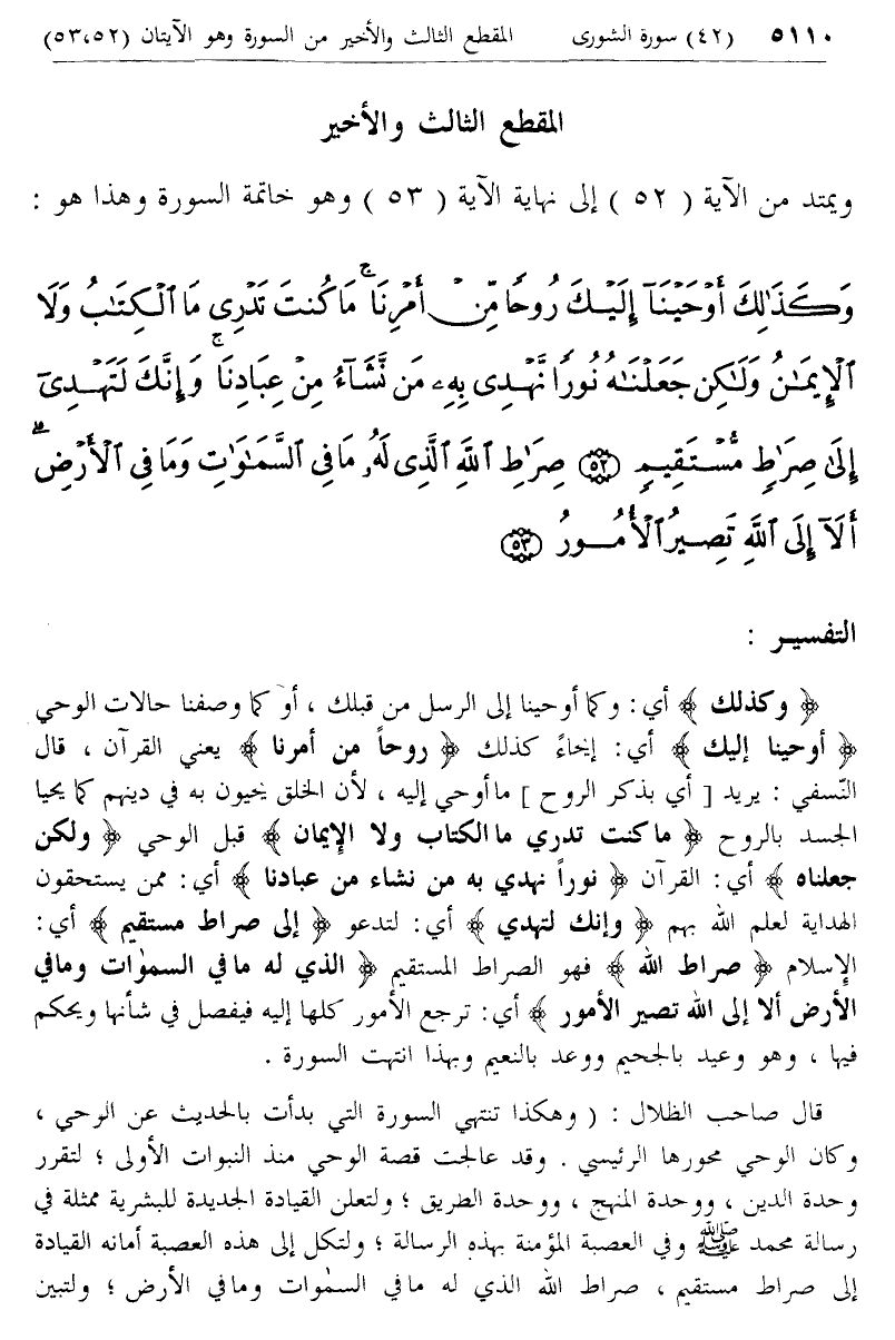قال صاحب الظلال: (وهكذا تنتهي السورة التي بدأت بالحديث عن الوحي، وكان الوحي محورها الرئيسي. وقد عالجت قصة الوحي منذ النبوات الأولى؛ لتقرر وحدة الدين، ووحدة المنهج، ووحدة الطريق؛ ولتعلن القيادة الجديدة للبشرية ممثلة في رسالة محمد صلّى الله عليه وسلم وفي العصبة المؤمنة بهذه الرسالة؛ ولتكل إلى هذه العصبة أمانة القيادة إلى صراط مستقيم، صراط الله الذي له ما في السموات وما في الأرض؛ ولتبين