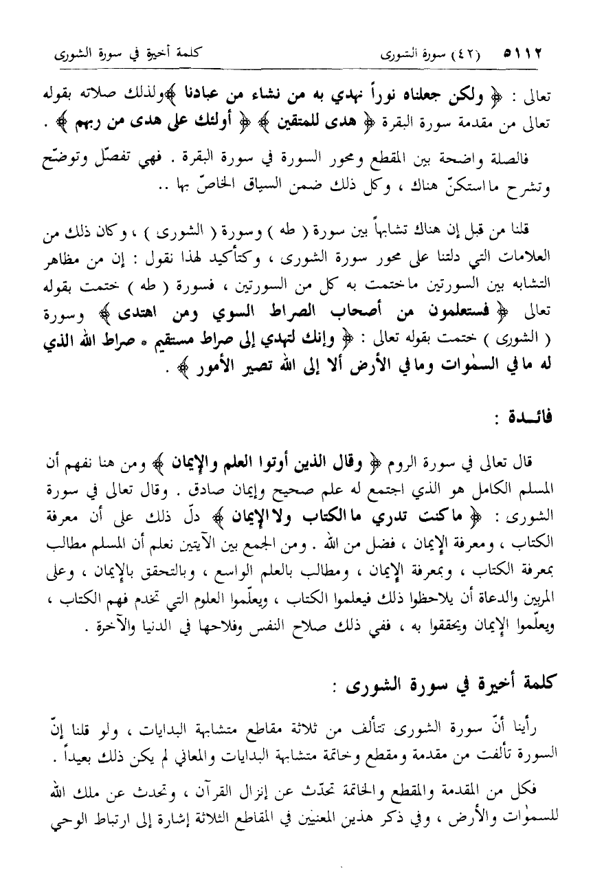 رأينا أنّ سورة الشورى تتألف من ثلاثة مقاطع متشابهة البدايات، ولو قلنا إنّ السورة تألفت من مقدمة ومقطع وخاتمة متشابهة البدايات والمعاني لم يكن ذلك بعيدا.