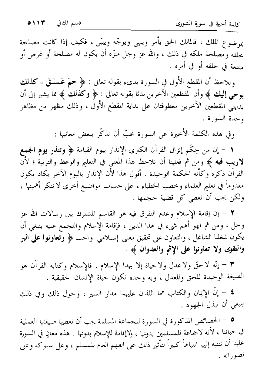 5 - الخصائص المذكورة في السورة للجماعة المسلمة يجب أن نعطيها صيغتها العملية في حياتنا، لأنه لا جماعة للمسلمين بدونها، ولا إقامة للإسلام بدونها. هذه معان في السورة علينا أن ننتبه إليها انتباها كبيرا لتأثير ذلك على الفهم العام للمسلم، وعلى سلوكه وعلى تصوراته.