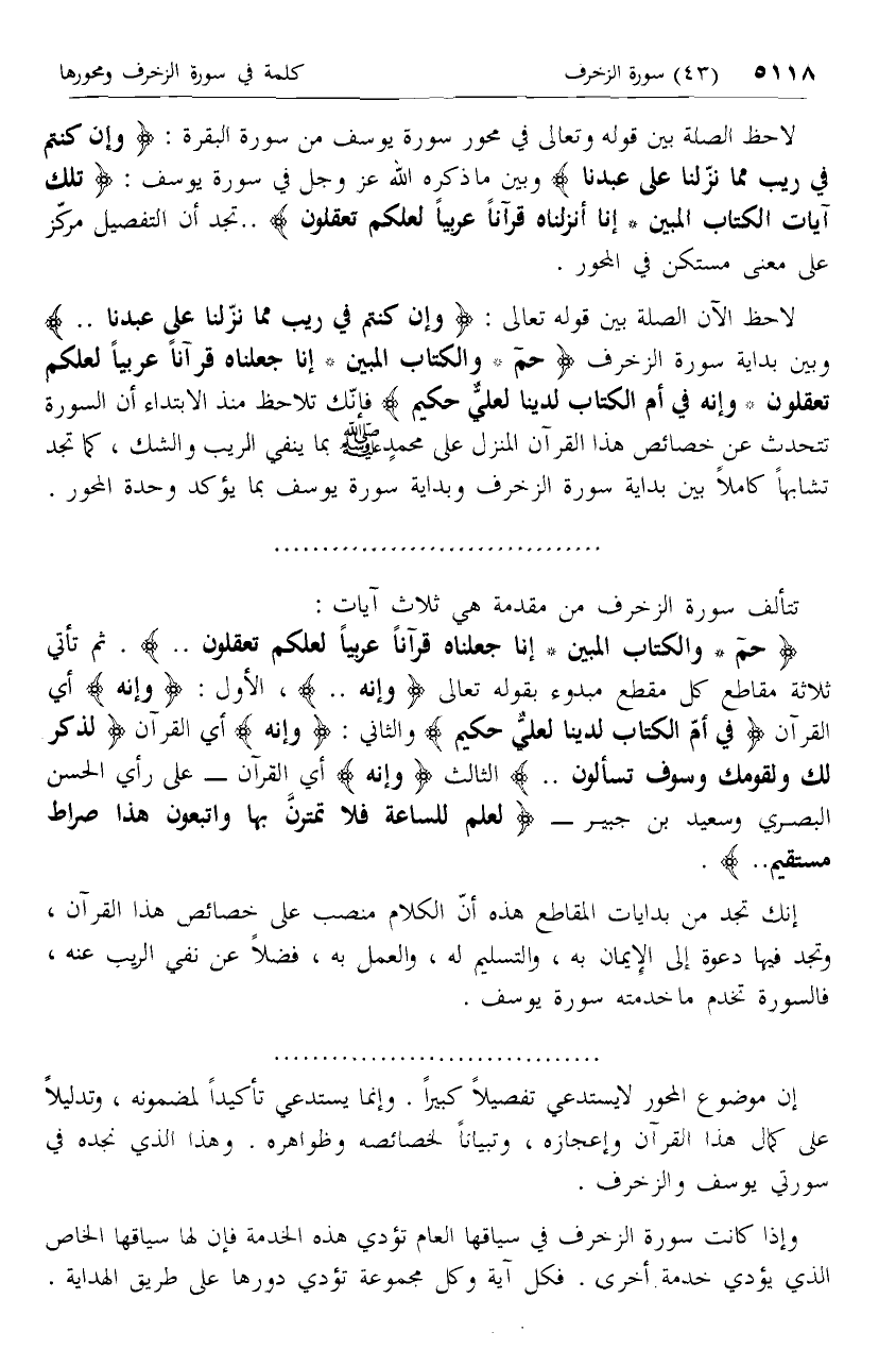 حم* وَالْكِتابِ الْمُبِينِ* إِنَّا جَعَلْناهُ قُرْآناً عَرَبِيًّا لَعَلَّكُمْ تَعْقِلُونَ ... ثم تأتي ثلاثة مقاطع كل مقطع مبدوء بقوله تعالى وَإِنَّهُ .. ، الأول: وَإِنَّهُ أي القرآن فِي أُمِّ الْكِتابِ لَدَيْنا لَعَلِيٌّ حَكِيمٌ والثاني: وَإِنَّهُ أي القرآن لَذِكْرٌ لَكَ وَلِقَوْمِكَ وَسَوْفَ تُسْئَلُونَ .. الثالث وَإِنَّهُ أي القرآن- على رأي الحسن البصري وسعيد بن جبير- لَعِلْمٌ لِلسَّاعَةِ فَلا تَمْتَرُنَّ بِها وَاتَّبِعُونِ هذا صِراطٌ مُسْتَقِيمٌ ...