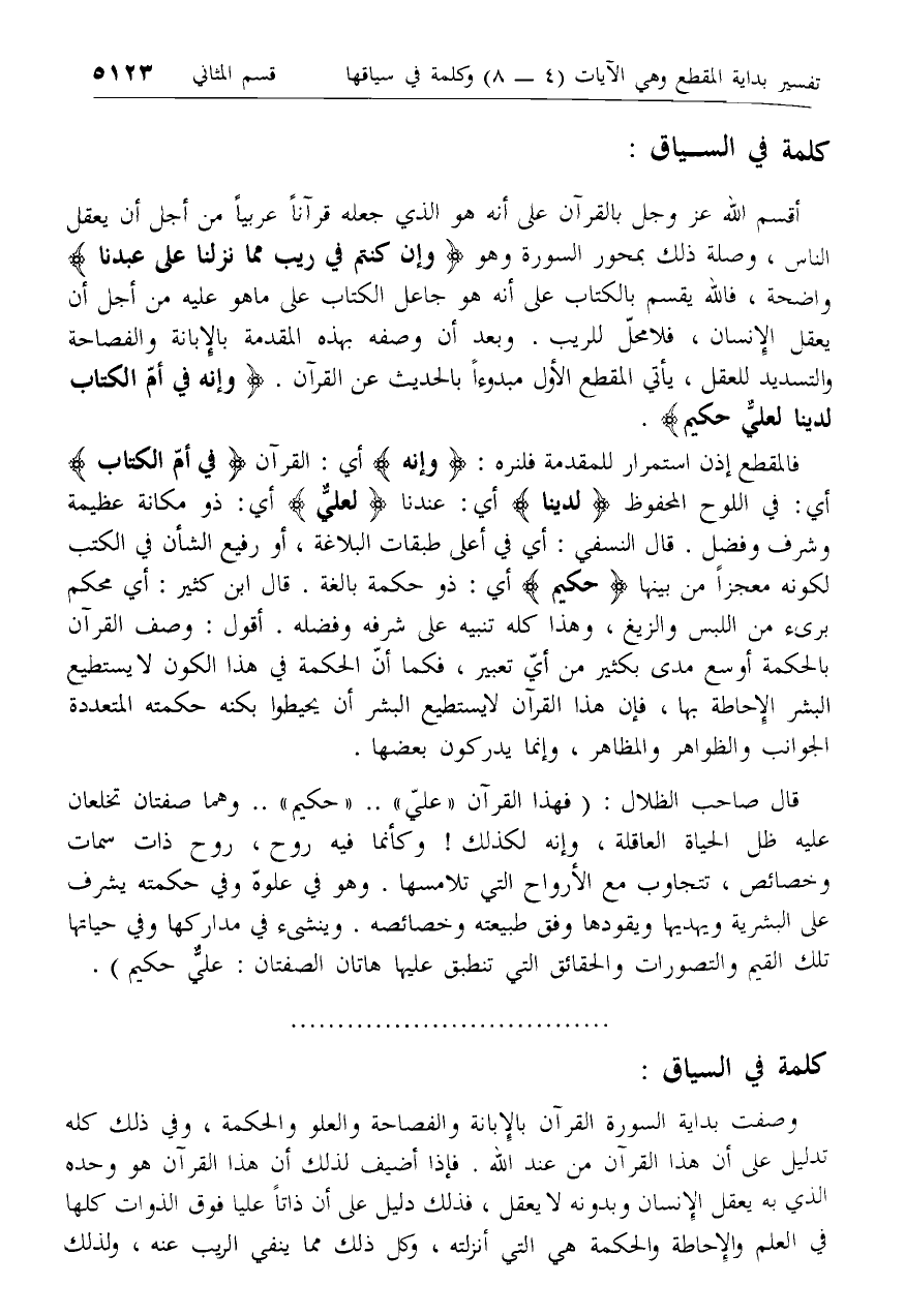 قال صاحب الظلال: (فهذا القرآن «عليّ» .. «حكيم» .. وهما صفتان تخلعان عليه ظل الحياة العاقلة، وإنه لكذلك! وكأنما فيه روح، روح ذات سمات وخصائص، تتجاوب مع الأرواح التي تلامسها. وهو في علوّه وفي حكمته يشرف على البشرية ويهديها ويقودها وفق طبيعته وخصائصه. وينشئ في مداركها وفي حياتها تلك القيم والتصورات والحقائق التي تنطبق عليها هاتان الصفتان: عليّ حكيم).