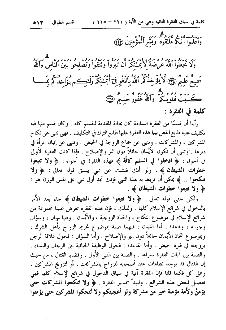 ولكن حتى قوله تعالى: وَلا تَتَّبِعُوا خُطُواتِ الشَّيْطانِ جاء بعد الأمر بالدخول في شرائع الإسلام كلها. ولذلك، فإن هذه الفقرة تعرض علينا مجموعة من شرائع الإسلام في موضوع النكاح، والحياة الزوجية، والأيمان. وفيها نهيان، وسؤال وجوابه، وقاعدة. أما النهيان: فلهما صلة بموضوع تحريم الزواج بأهل الشرك، وبموضوع اتخاذ الأيمان حائلا دون البر والإصلاح. وأما السؤال: فحول علاقة الرجل بزوجته في فترة الحيض. وأما القاعدة: فحول الوظيفة الحياتية بين الرجال والنساء.