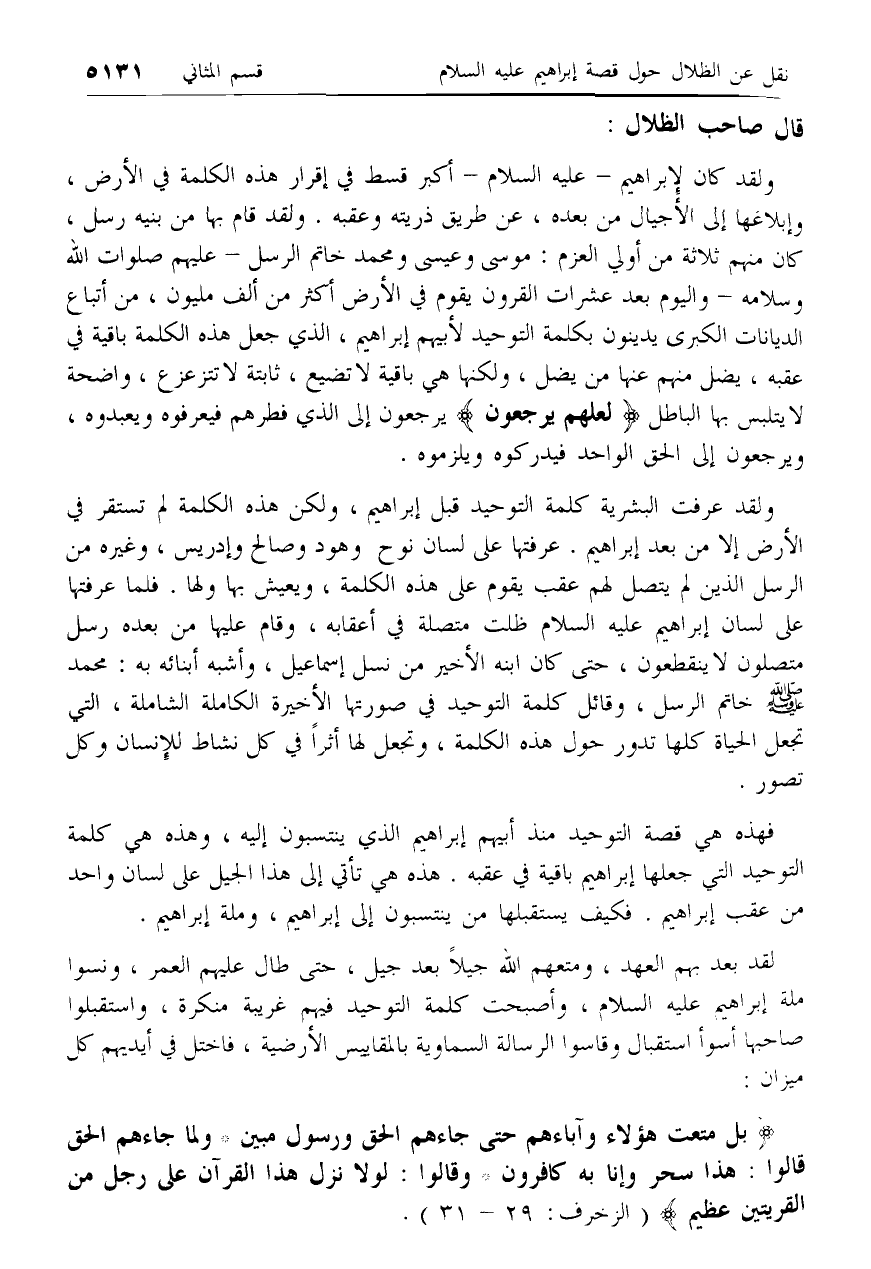 قال صاحب الظلال: [حول دور إبراهيم- عليه السلام- في إقرار كلمة التوحيد في الأرض]