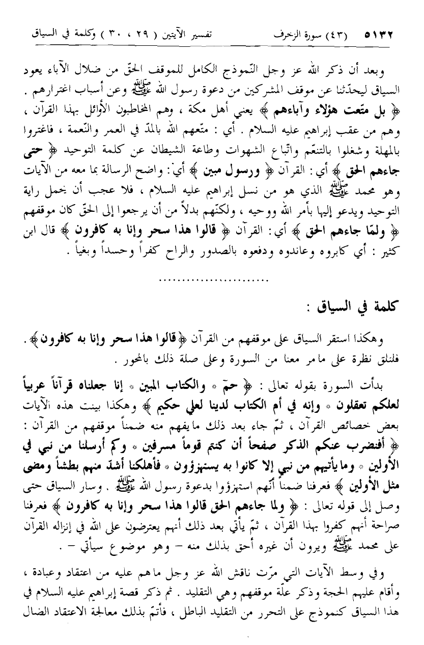 أَفَنَضْرِبُ عَنْكُمُ الذِّكْرَ صَفْحاً أَنْ كُنْتُمْ قَوْماً مُسْرِفِينَ* وَكَمْ أَرْسَلْنا مِنْ نَبِيٍّ فِي الْأَوَّلِينَ* وَما يَأْتِيهِمْ مِنْ نَبِيٍّ إِلَّا كانُوا بِهِ يَسْتَهْزِؤُنَ* فَأَهْلَكْنا أَشَدَّ مِنْهُمْ بَطْشاً وَمَضى مَثَلُ الْأَوَّلِينَ فعرفنا ضمنا أنّهم استهزءوا بدعوة رسول الله صلّى الله عليه وسلم. وسار السياق حتى وصل إلى قوله تعالى: وَلَمَّا جاءَهُمُ الْحَقُّ قالُوا هذا سِحْرٌ وَإِنَّا بِهِ كافِرُونَ فعرفنا صراحة أنهم كفروا بهذا القرآن، ثمّ يأتي بعد ذلك أنهم يعترضون على الله في إنزاله القرآن على محمد صلّى الله عليه وسلم ويرون أن غيره أحق بذلك منه- وهو موضوع سيأتي-.