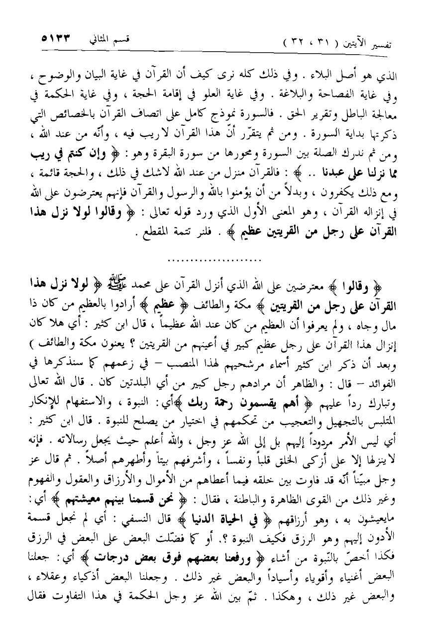 وَقالُوا معترضين على الله الذي أنزل القرآن على محمد صلّى الله عليه وسلم لَوْلا نُزِّلَ هذَا الْقُرْآنُ عَلى رَجُلٍ مِنَ الْقَرْيَتَيْنِ مكة والطائف عَظِيمٍ أرادوا بالعظيم من كان ذا مال وجاه، ولم يعرفوا أن العظيم من كان عند الله عظيما، قال ابن كثير: أي هل كان إنزال هذا القرآن على رجل عظيم كبير في أعينهم من القريتين؟ يعنون مكة والطائف) وبعد أن ذكر ابن كثير أسماء مرشحيهم لهذا المنصب- في زعمهم كما سنذكرها في الفوائد- قال: والظاهر أن مرادهم رجل كبير من أي البلدتين كان. قال الله تعالى وتبارك ردا عليهم
