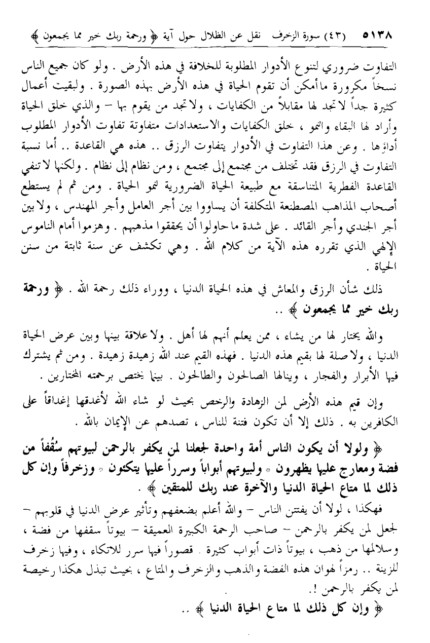 التفاوت ضروري لتنوع الأدوار المطلوبة للخلافة في هذه الأرض. ولو كان جميع الناس نسخا مكرورة ما أمكن أن تقوم الحياة في هذه الأرض بهذه الصورة. ولبقيت أعمال كثيرة جدا لا تجد لها مقابلا من الكفايات، ولا تجد من يقوم بها- والذي خلق الحياة وأراد لها البقاء والنمو، خلق الكفايات والاستعدادات متفاوتة تفاوت الأدوار المطلوب أداؤها. وعن هذا التفاوت في الأدوار يتفاوت الرزق .. هذه هي القاعدة .. أما نسبة التفاوت في الرزق فقد تختلف من مجتمع إلى مجتمع، ومن نظام إلى نظام. ولكنها لا تنفي القاعدة الفطرية المتناسقة مع طبيعة الحياة الضرورية لنمو الحياة. ومن ثم لم يستطع أصحاب المذاهب المصطنعة المتكلفة أن يساووا بين أجر العامل وأجر المهندس، ولا بين أجر الجندي وأجر القائد. على شدة ما حاولوا أن يحققوا مذهبهم. وهزموا أمام الناموس الإلهي الذي تقرره هذه الآية من كلام الله. وهي تكشف عن سنة ثابتة من سنن الحياة.