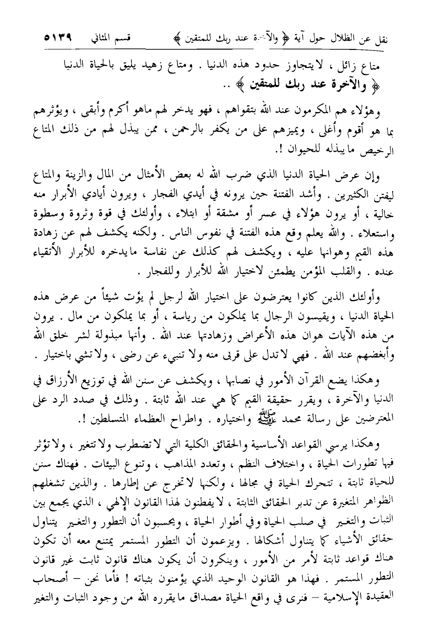 وهكذا يرسي القواعد الأساسية والحقائق الكلية التي لا تضطرب ولا تتغير، ولا تؤثر فيها تطورات الحياة، واختلاف النظم، وتعدد المذاهب، وتنوع البيئات. فهناك سنن للحياة ثابتة، تتحرك الحياة في مجالها، ولكنها لا تخرج عن إطارها. والذين تشغلهم الظواهر المتغيرة عن تدبر الحقائق الثابتة، لا يفطنون لهذا القانون الإلهي، الذي يجمع بين الثبات والتغير في صلب الحياة وفي أطوار الحياة، ويحسبون أن التطور والتغير يتناول حقائق الأشياء كما يتناول أشكالها. ويزعمون أن التطور المستمر يمتنع معه أن تكون هناك قواعد ثابتة لأمر من الأمور، وينكرون أن يكون هناك قانون ثابت غير قانون التطور المستمر. فهذا هو القانون الوحيد الذي يؤمنون بثباته! فأما نحن- أصحاب العقيدة الإسلامية- فنرى في واقع الحياة مصداق ما يقرره الله من وجود الثبات والتغير
