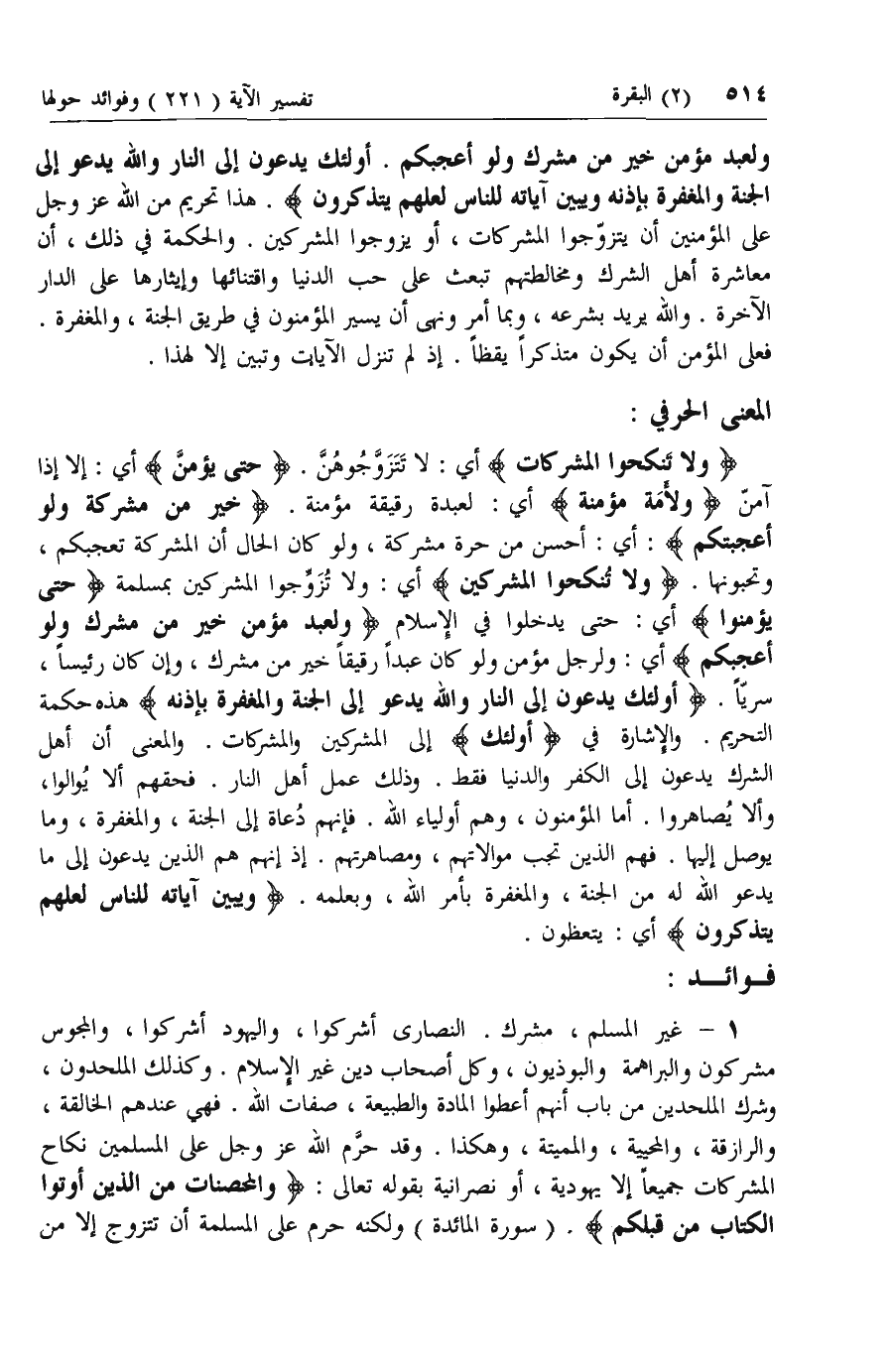 وَلَعَبْدٌ مُؤْمِنٌ خَيْرٌ مِنْ مُشْرِكٍ وَلَوْ أَعْجَبَكُمْ. أُولئِكَ يَدْعُونَ إِلَى النَّارِ وَاللَّهُ يَدْعُوا إِلَى الْجَنَّةِ وَالْمَغْفِرَةِ بِإِذْنِهِ وَيُبَيِّنُ آياتِهِ لِلنَّاسِ لَعَلَّهُمْ يَتَذَكَّرُونَ. هذا تحريم من الله عزّ وجل على المؤمنين أن يتزوجوا المشركات، أو يزوجوا المشركين. والحكمة في ذلك، أن معاشرة أهل الشرك ومخالطتهم تبعث على حب الدنيا واقتنائها وإيثارها على الدار الآخرة. والله يريد بشرعه، وبما أمر ونهى أن يسير المؤمنون في طريق الجنة، والمغفرة.