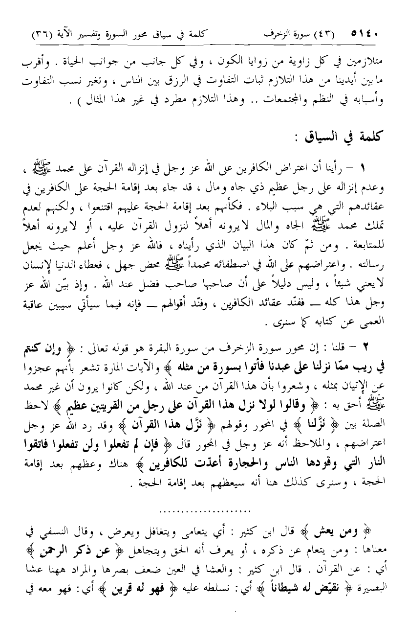 2 - قلنا: إن محور سورة الزخرف من سورة البقرة هو قوله تعالى: وَإِنْ كُنْتُمْ فِي رَيْبٍ مِمَّا نَزَّلْنا عَلى عَبْدِنا فَأْتُوا بِسُورَةٍ مِنْ مِثْلِهِ والآيات المارة تشعر بأنهم عجزوا عن الإتيان بمثله، وشعروا بأن هذا القرآن من عند الله، ولكن كانوا يرون أن غير محمد صلّى الله عليه وسلم أحق به: وَقالُوا لَوْلا نُزِّلَ هذَا الْقُرْآنُ عَلى رَجُلٍ مِنَ الْقَرْيَتَيْنِ عَظِيمٍ لاحظ الصلة بين نَزَّلْنا في المحور وقولهم نُزِّلَ هذَا الْقُرْآنُ وقد رد الله عزّ وجل اعتراضهم، والملاحظ أنه عزّ وجل في المحور قال فَإِنْ لَمْ تَفْعَلُوا وَلَنْ تَفْعَلُوا فَاتَّقُوا النَّارَ الَّتِي وَقُودُهَا النَّاسُ وَالْحِجارَةُ أُعِدَّتْ لِلْكافِرِينَ هناك وعظهم بعد إقامة الحجة، وسنرى كذلك هنا أنه سيعظهم بعد إقامة الحجة.