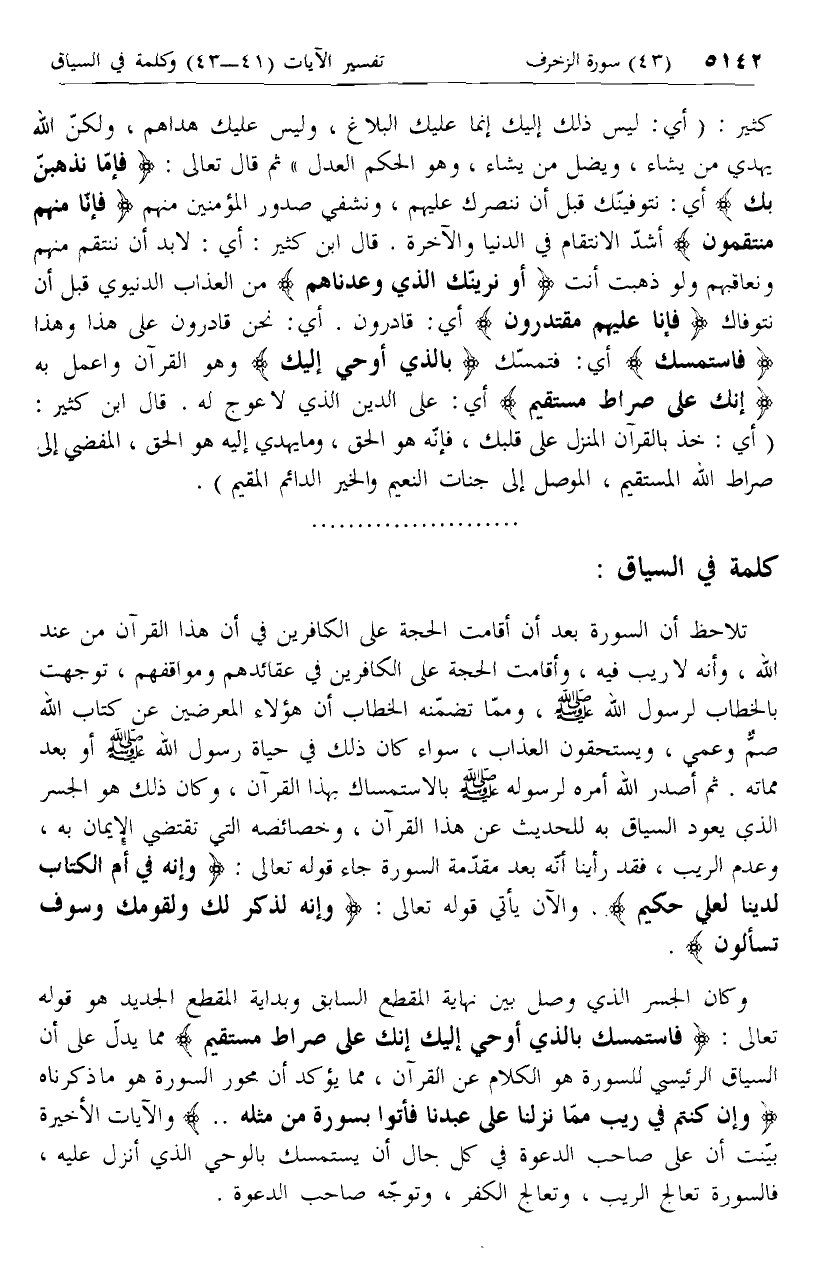تلاحظ أن السورة بعد أن أقامت الحجة على الكافرين في أن هذا القرآن من عند الله، وأنه لا ريب فيه، وأقامت الحجة على الكافرين في عقائدهم ومواقفهم، توجهت بالخطاب لرسول الله صلّى الله عليه وسلم، وممّا تضمّنه الخطاب أن هؤلاء المعرضين عن كتاب الله صمّ وعمي، ويستحقون العذاب، سواء كان ذلك في حياة رسول الله صلّى الله عليه وسلم أو بعد مماته. ثم أصدر الله أمره لرسوله صلّى الله عليه وسلم بالاستمساك بهذا القرآن، وكان ذلك هو الجسر الذي يعود السياق به للحديث عن هذا القرآن، وخصائصه التي تقتضي الإيمان به، وعدم الريب، فقد رأينا أنّه بعد مقدّمة السورة جاء قوله تعالى: وَإِنَّهُ فِي أُمِّ الْكِتابِ لَدَيْنا لَعَلِيٌّ حَكِيمٌ. والآن يأتي قوله تعالى: وَإِنَّهُ لَذِكْرٌ لَكَ وَلِقَوْمِكَ وَسَوْفَ تُسْئَلُونَ.