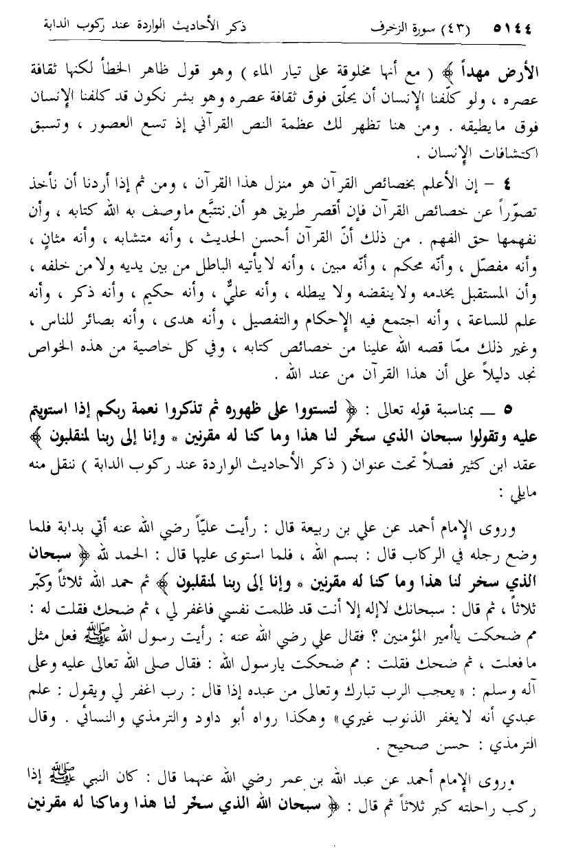 بمناسبة قوله تعالى: لِتَسْتَوُوا عَلى ظُهُورِهِ ثُمَّ تَذْكُرُوا نِعْمَةَ رَبِّكُمْ إِذَا اسْتَوَيْتُمْ عَلَيْهِ وَتَقُولُوا سُبْحانَ الَّذِي سَخَّرَ لَنا هذا وَما كُنَّا لَهُ مُقْرِنِينَ* وَإِنَّا إِلى رَبِّنا لَمُنْقَلِبُونَ عقد ابن كثير فصلا تحت عنوان (ذكر الأحاديث الواردة عند ركوب الدابة) ننقل منه ما يلي: