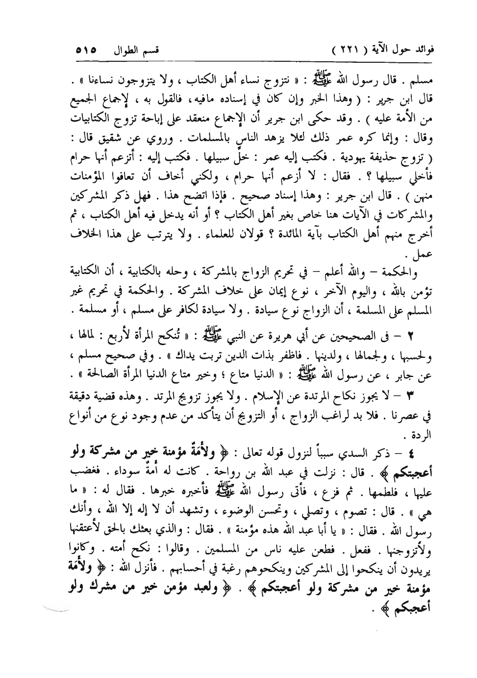 4 - ذكر السدي سببا لنزول قوله تعالى: وَلَأَمَةٌ مُؤْمِنَةٌ خَيْرٌ مِنْ مُشْرِكَةٍ وَلَوْ أَعْجَبَتْكُمْ. قال: نزلت في عبد الله بن رواحة. كانت له أمة سوداء. فغضب عليها، فلطمها. ثم فزع، فأتى رسول الله صلى الله عليه وسلم فأخبره خبرها. فقال له: «ما هي». قال: تصوم، وتصلي، وتحسن الوضوء، وتشهد أن لا إله إلا الله، وأنك رسول الله. فقال: «يا أبا عبد الله هذه مؤمنة». فقال: والذي بعثك بالحق لأعتقنها ولأتزوجنها. ففعل. فطعن عليه ناس من المسلمين. وقالوا: نكح أمته. وكانوا يريدون أن ينكحوا إلى المشركين وينكحوهم رغبة في أحسابهم. فأنزل الله: وَلَأَمَةٌ مُؤْمِنَةٌ خَيْرٌ مِنْ مُشْرِكَةٍ وَلَوْ أَعْجَبَتْكُمْ. وَلَعَبْدٌ مُؤْمِنٌ خَيْرٌ مِنْ مُشْرِكٍ وَلَوْ أَعْجَبَكُمْ.