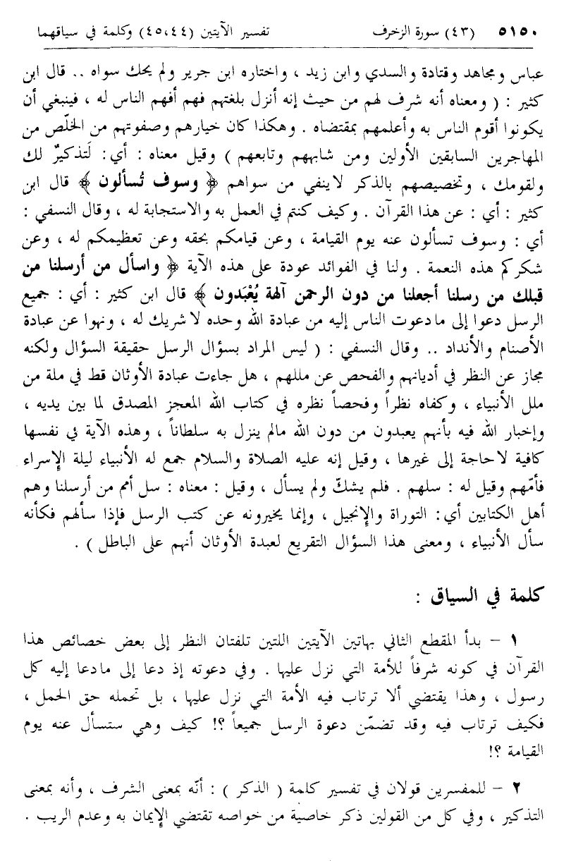 عباس ومجاهد وقتادة والسدي وابن زيد، واختاره ابن جرير ولم يحك سواه .. قال ابن كثير: (ومعناه أنه شرف لهم من حيث إنه أنزل بلغتهم فهم أفهم الناس له، فينبغي أن يكونوا أقوم الناس به وأعلمهم بمقتضاه. وهكذا كان خيارهم وصفوتهم من الخلّص من المهاجرين السابقين الأولين ومن شابههم وتابعهم) وقيل معناه: أي: لتذكير لك ولقومك، وتخصيصهم بالذكر لا ينفي من سواهم وَسَوْفَ تُسْئَلُونَ قال ابن كثير: أي: عن هذا القرآن. وكيف كنتم في العمل به والاستجابة له، وقال النسفي: