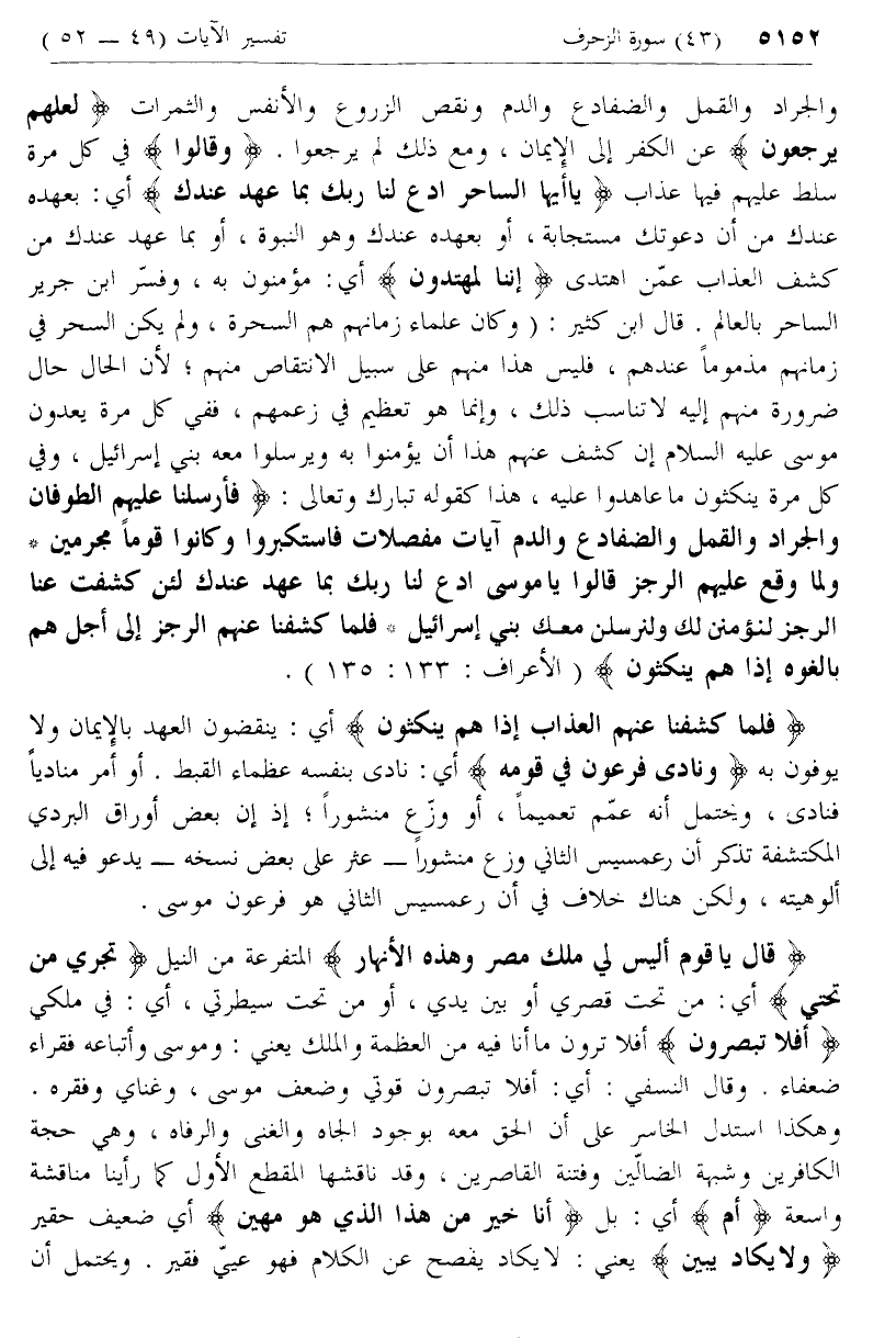 قالَ يا قَوْمِ أَلَيْسَ لِي مُلْكُ مِصْرَ وَهذِهِ الْأَنْهارُ المتفرعة من النيل تَجْرِي مِنْ تَحْتِي أي: من تحت قصري أو بين يدي، أو من تحت سيطرتي، أي: في ملكي أَفَلا تُبْصِرُونَ أفلا ترون ما أنا فيه من العظمة والملك يعني: وموسى وأتباعه فقراء ضعفاء. وقال النسفي: أي: أفلا تبصرون قوتي وضعف موسى، وغناي وفقره.