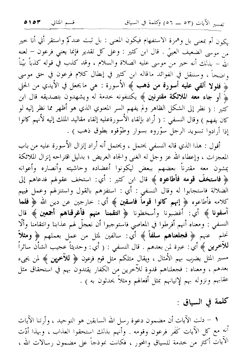 فَلَوْلا أُلْقِيَ عَلَيْهِ أَسْوِرَةٌ مِنْ ذَهَبٍ الأسورة: هي ما يجعل في الأيدي من الحلي أَوْ جاءَ مَعَهُ الْمَلائِكَةُ مُقْتَرِنِينَ يكتنفونه خدمة له ويشهدون بتصديقه قال ابن كثير: (نظر إلى الشكل الظاهر ولم يفهم السر المعنوي الذي هو أظهر مما نظر إليه لو كان يفهم) وقال النسفي: (أراد بإلقاء الأسورة عليه إلقاء مقاليد الملك إليه لأنهم كانوا إذا أرادوا تسويد الرجل سوّروه بسوار وطوّقوه بطوق ذهب).